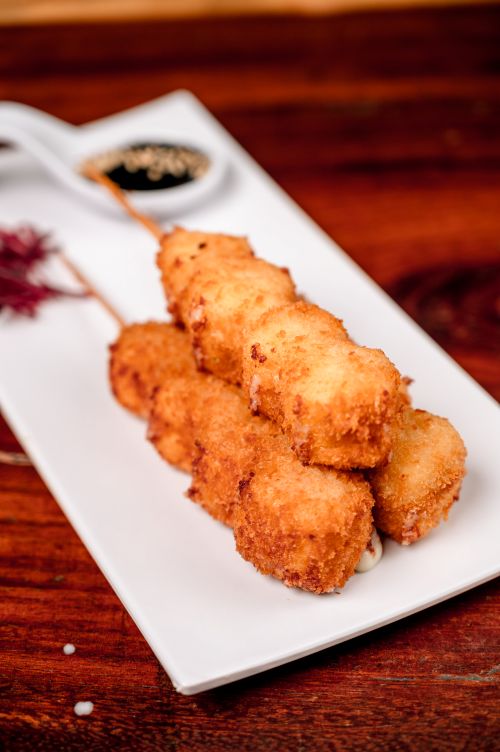 Brocheta de queso capeada, bañada en salsa de anguila.