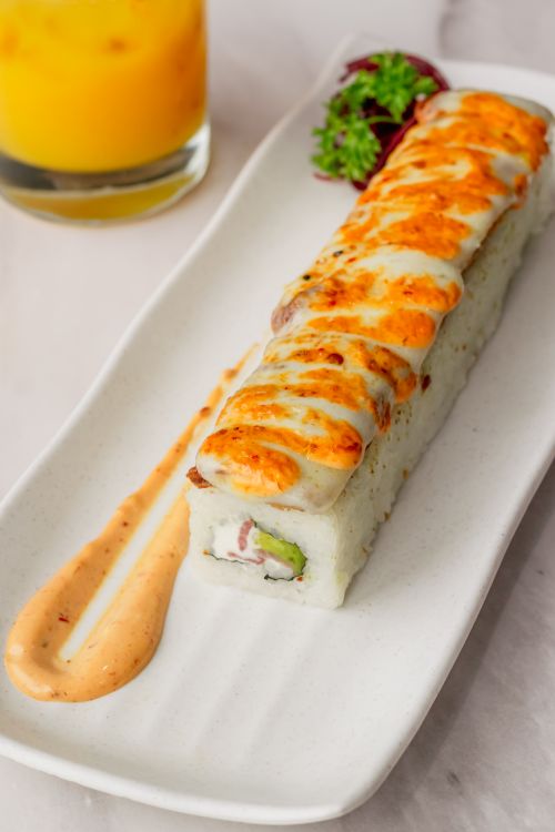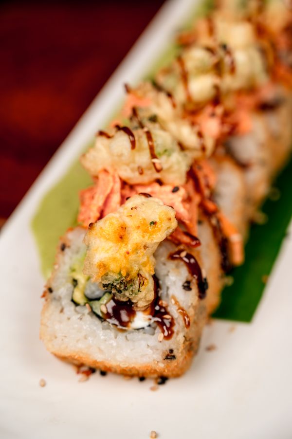 Queso crema, aguacate y pepino. Topping de zanahoria con chipotle, togarashi y brocoli en tempura. Bañado en salsa