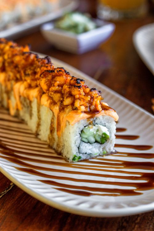 Queso crema, aguacate y camarón. Topping de tampico, bañado en salsa de anguila, con un toque de sriracha.