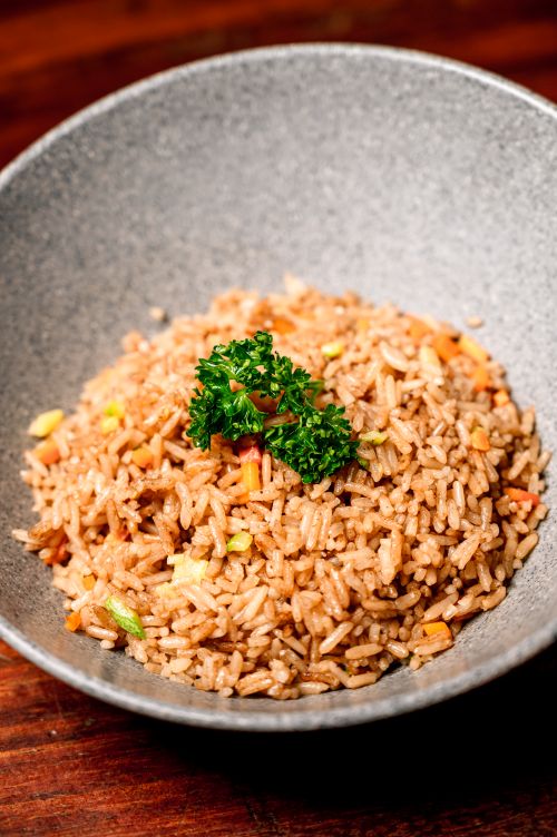 Arroz frito con calabaza y zanahoria, queso crema, tampico, aguacate, res, pollo y camarón, bañado en salsa de anguila.