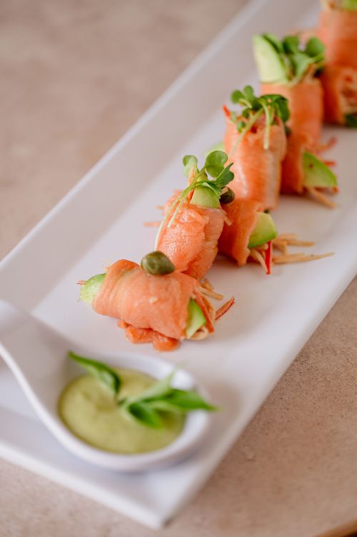 Hoja de pepino rellena de tampico, aguacate, queso crema y camarón. Sin arroz