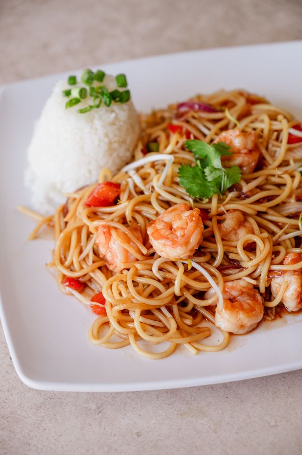 Noodles con morrón rojo y verde, cebollita cambray, cebolla morada y frijolillo en deliciosa salsa spicy con la carne
