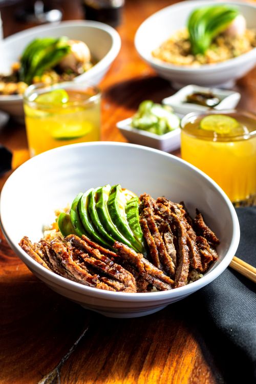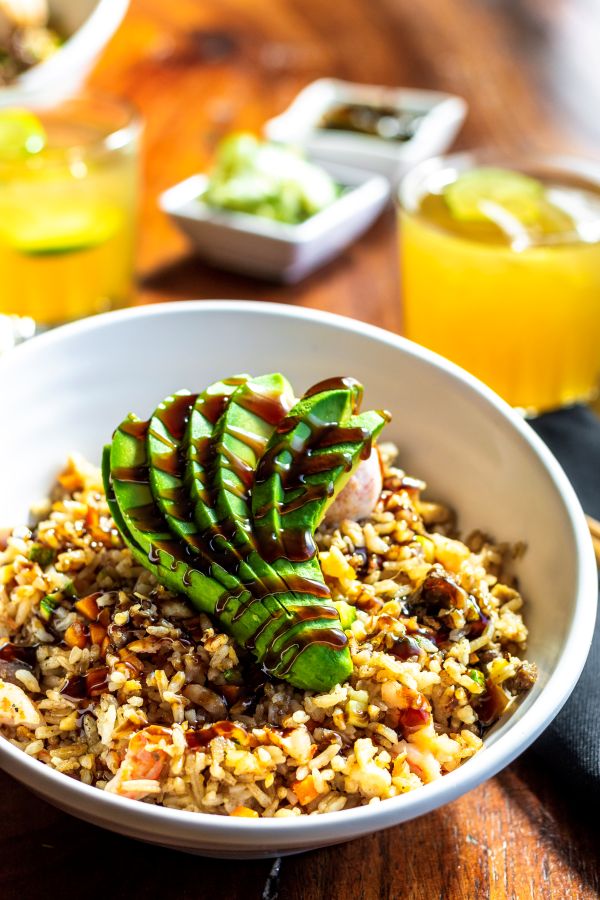 Arroz frito acompañado de tiras de milanesa, aguacate, queso crema, Tampico y vegetales, bañado en salsa de anguila.