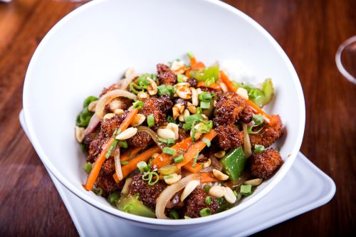 Pollo crispy agridulce, zanahoria, cebolla morada y cambray, morrón verde y cacahuate montado en arroz blanco.