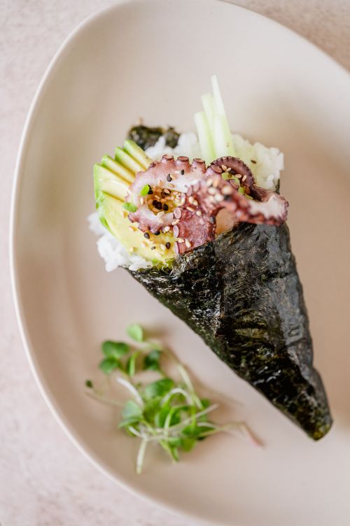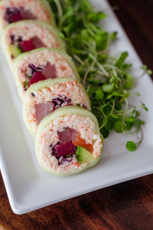 Hoja de pepino rellena de tampico, salmón, atún, jurel, aguacate y col morada.