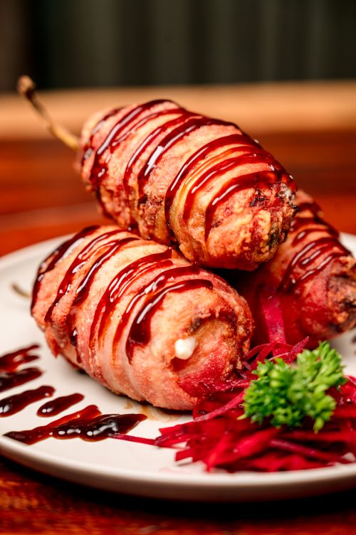 Espárragos envueltos en jugosa carne de sirloin, bañados de una salsa agridulce. Única para maridar con un buen vino tinto.