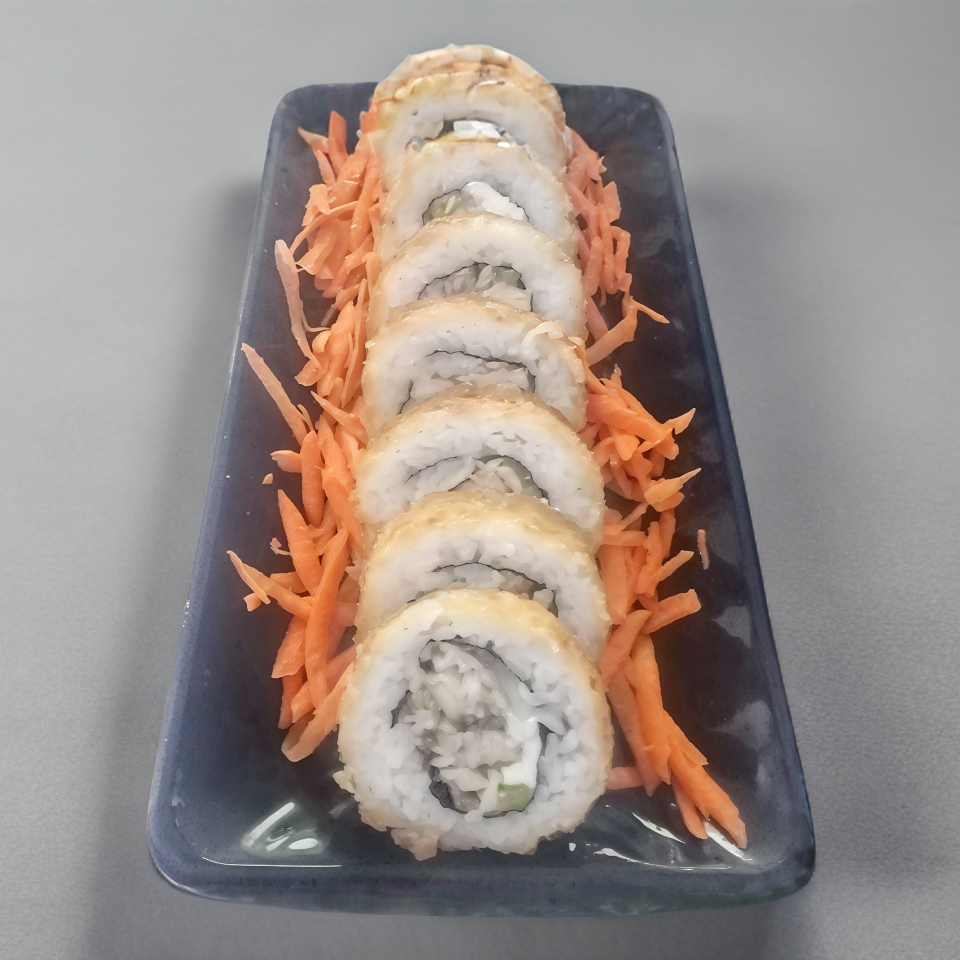 Queso Philadelphia, aguacate y camarón empanizado, por fuera topping de kanikama, cebollín y trozos de camarón empanizado bañado en salsa de anguila y sirriacha