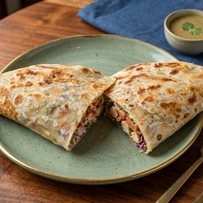 Quesadilla (tortilla de harina grande) con camarón capeado, verduras, salsa y aderezos