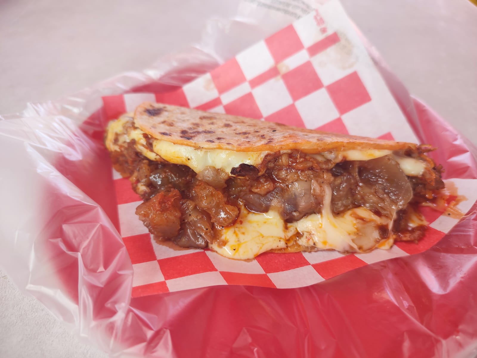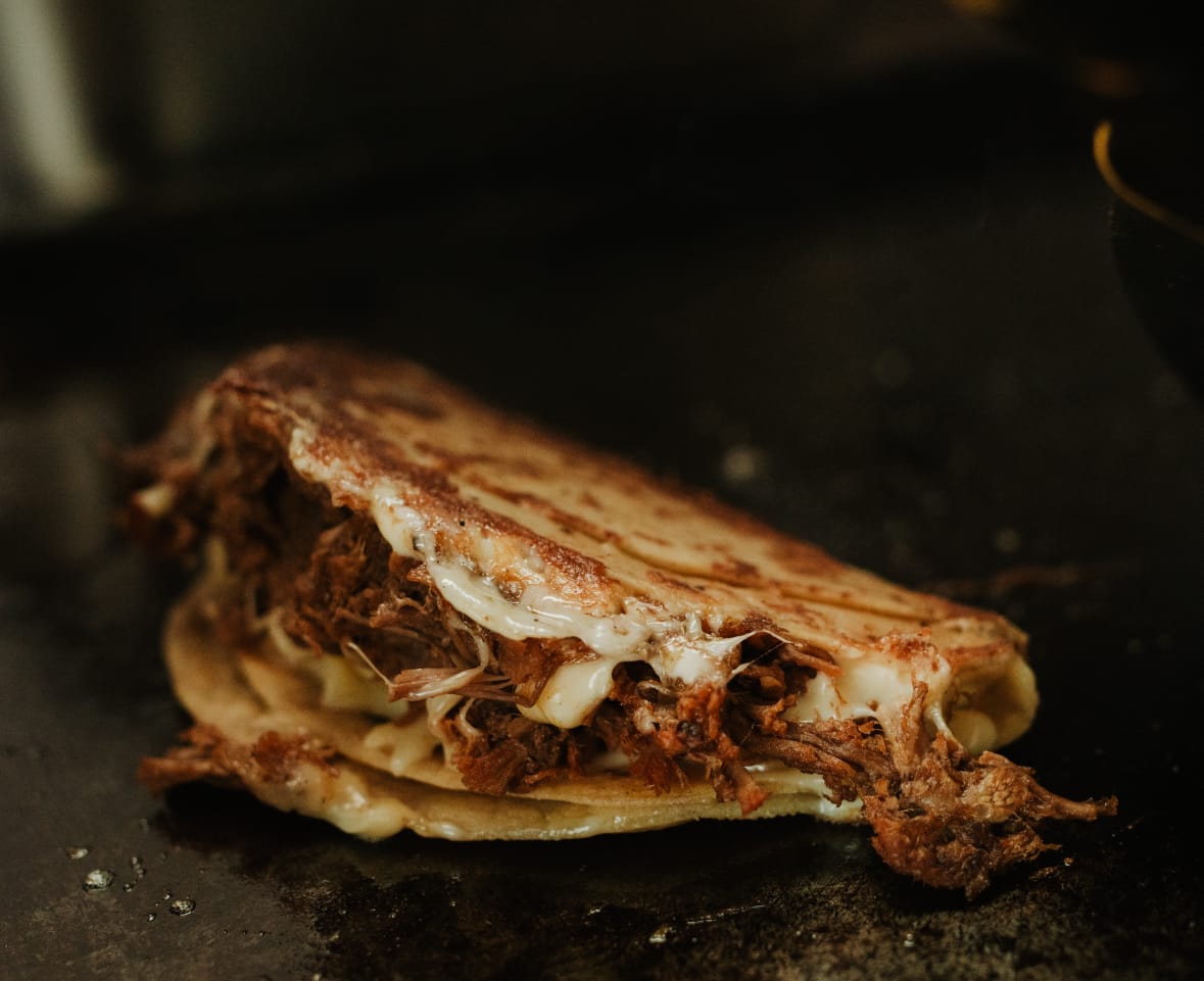 Tortilla de maiz dorada al comal con una base de queso gouda gratinada y encima birria dorada.