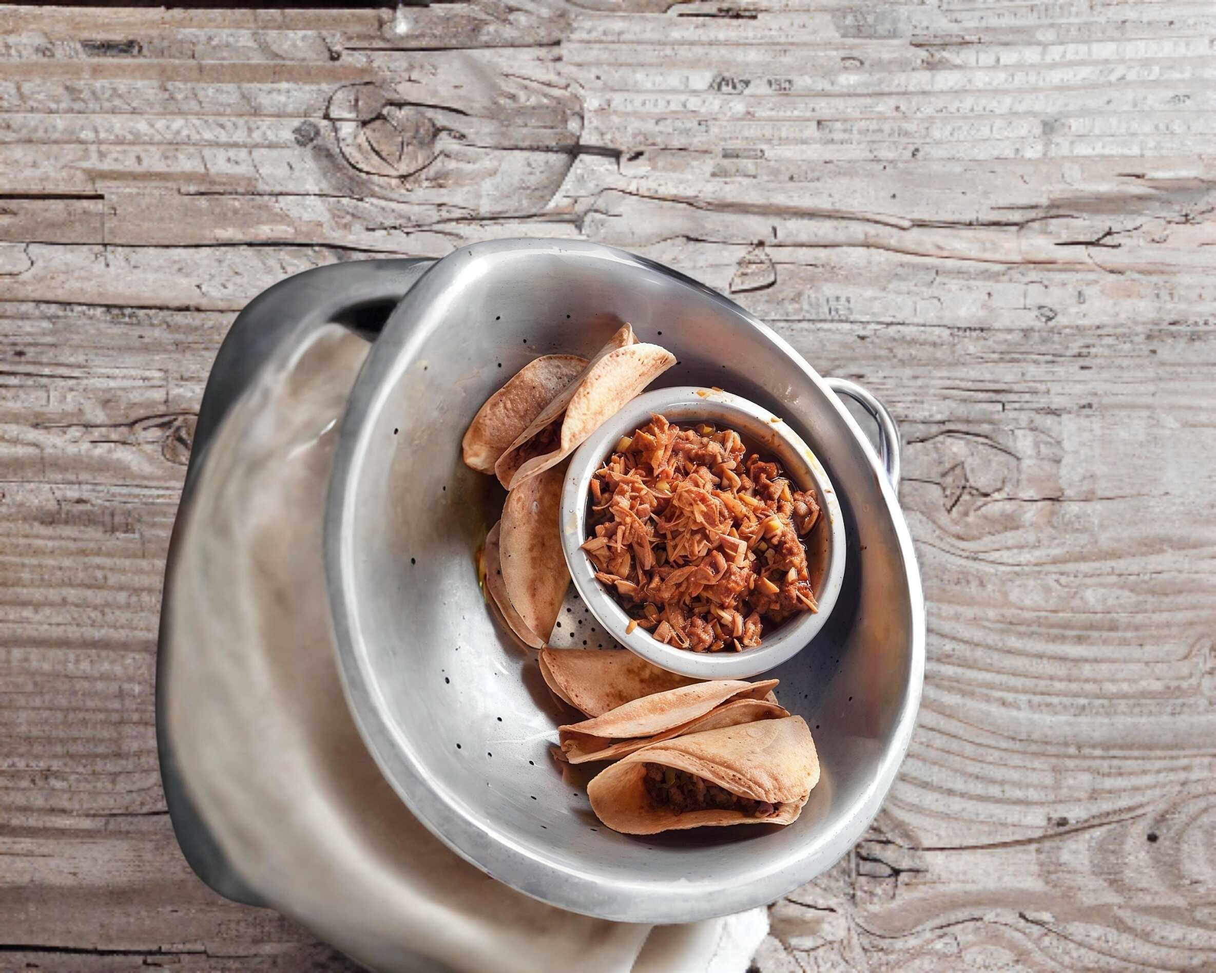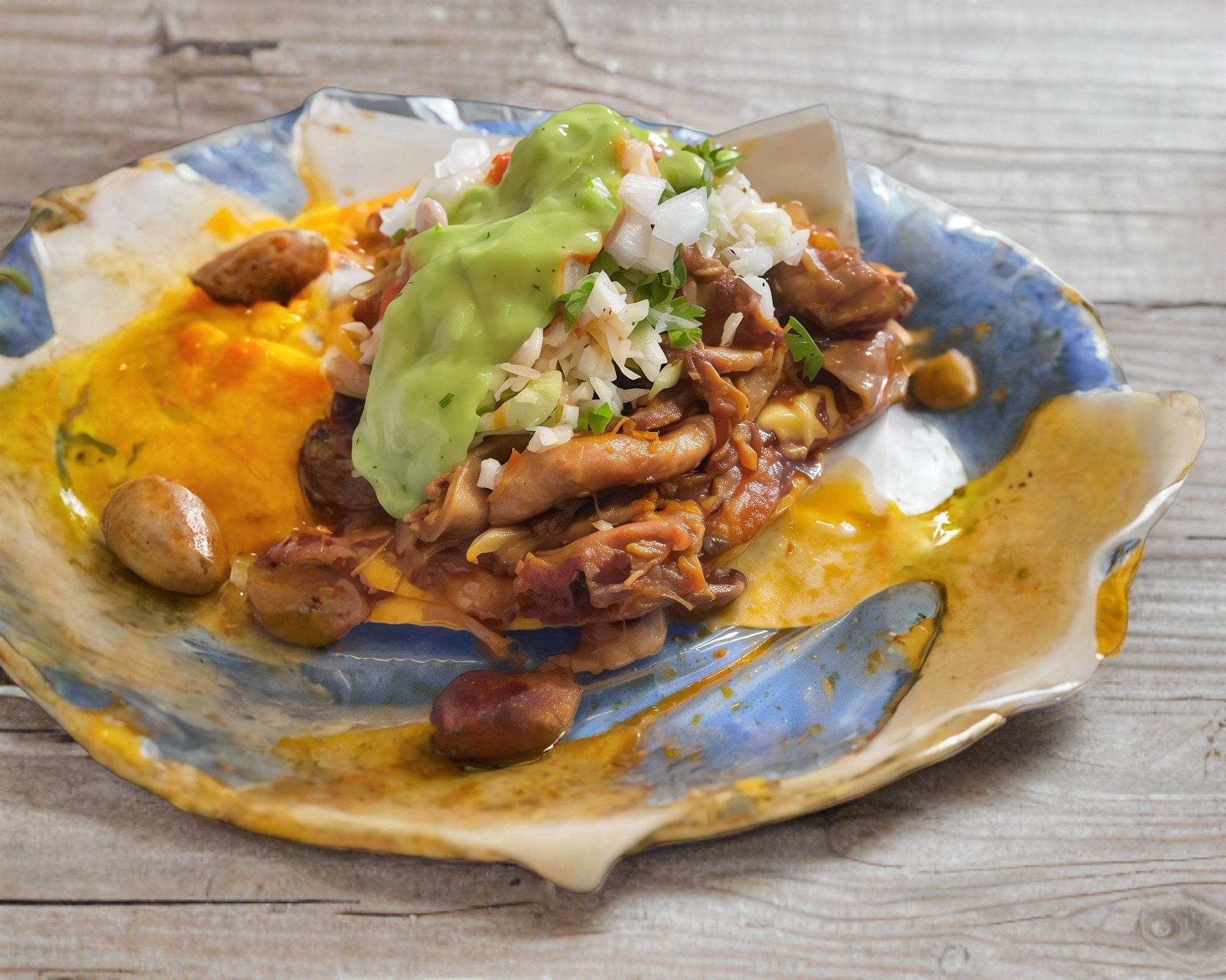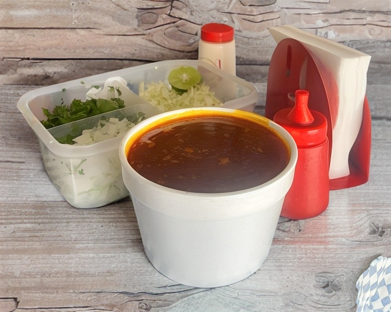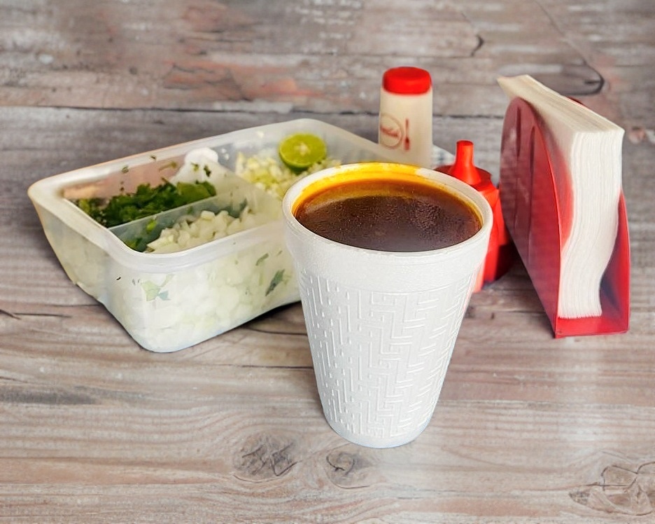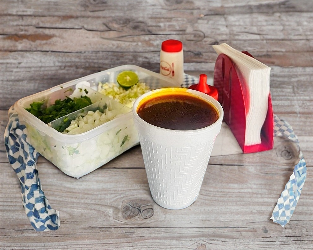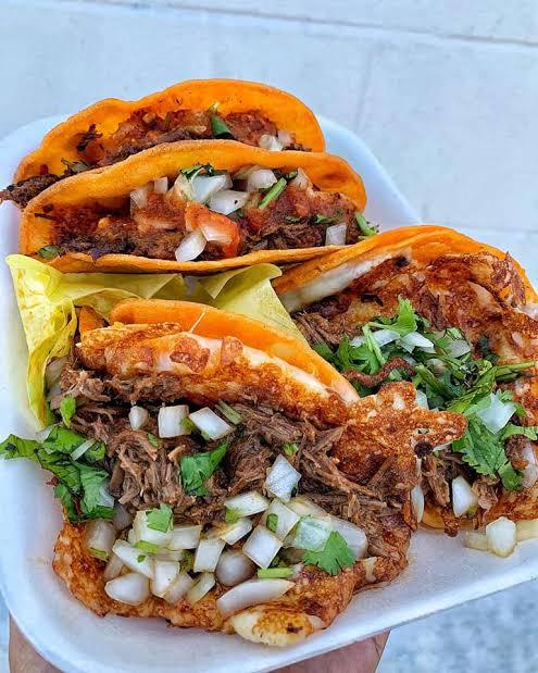 Quesabirrias preparado con tortilla, queso, carne, guacamole, Incluye salsa y verdura, repolla con cilantro, cebolla y limón