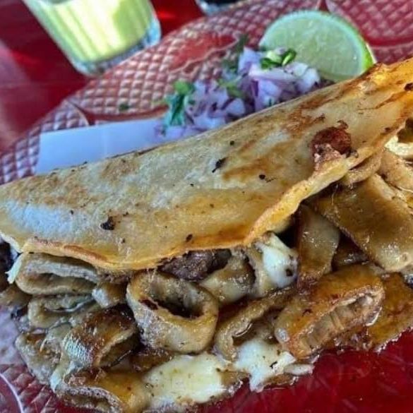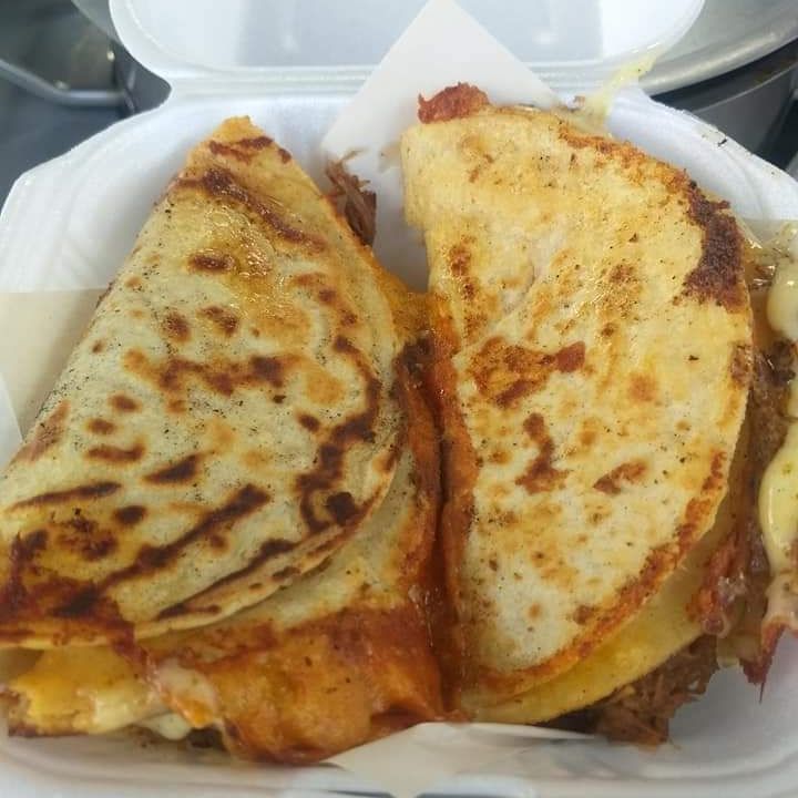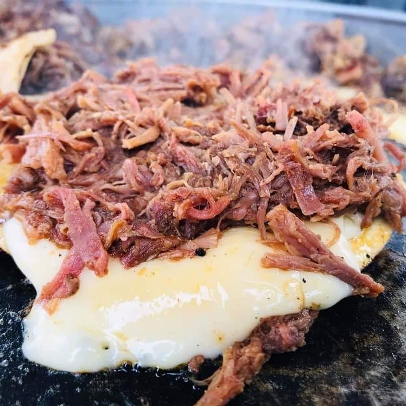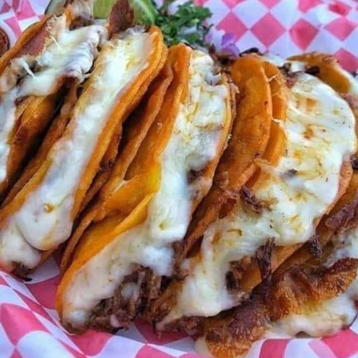 Tortilla de maiz dorada al comal con una base de queso gouda gratinada y encima birria dorada.