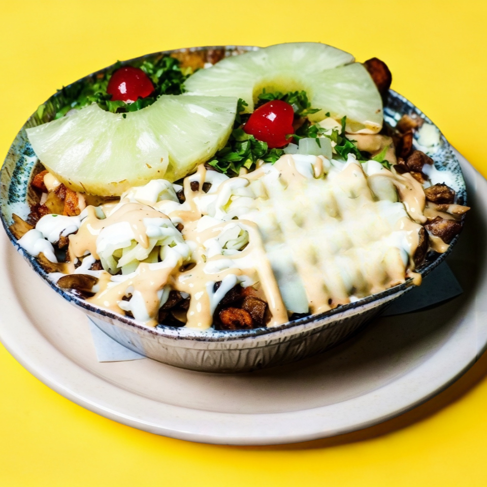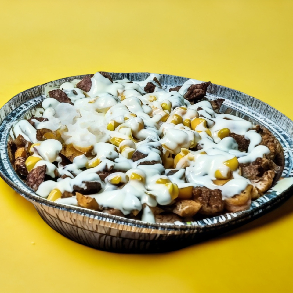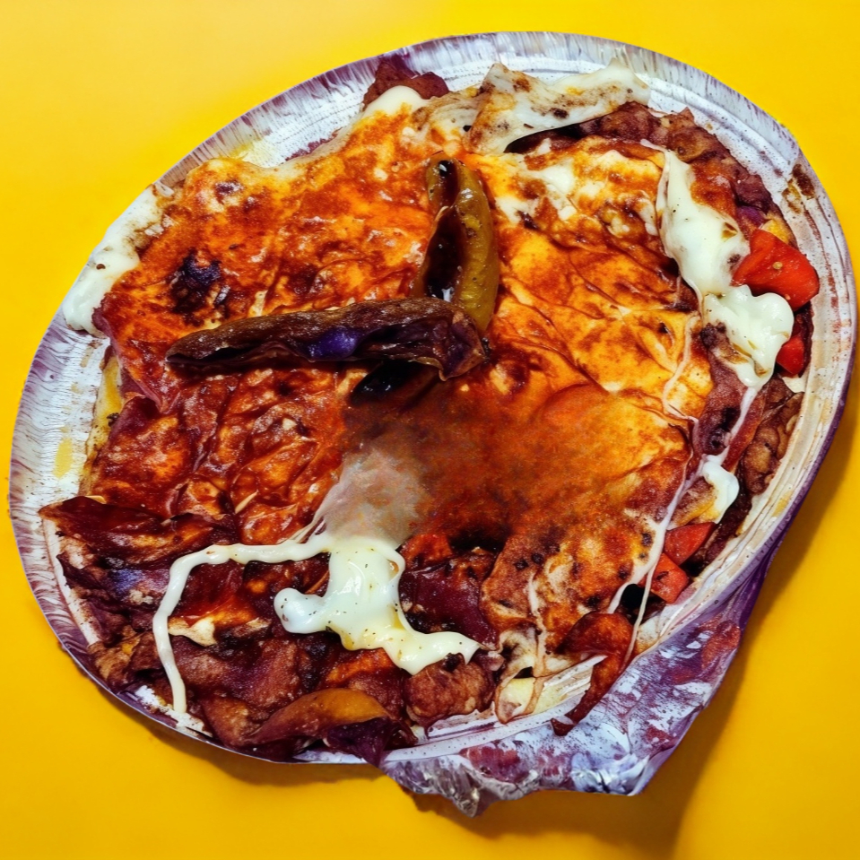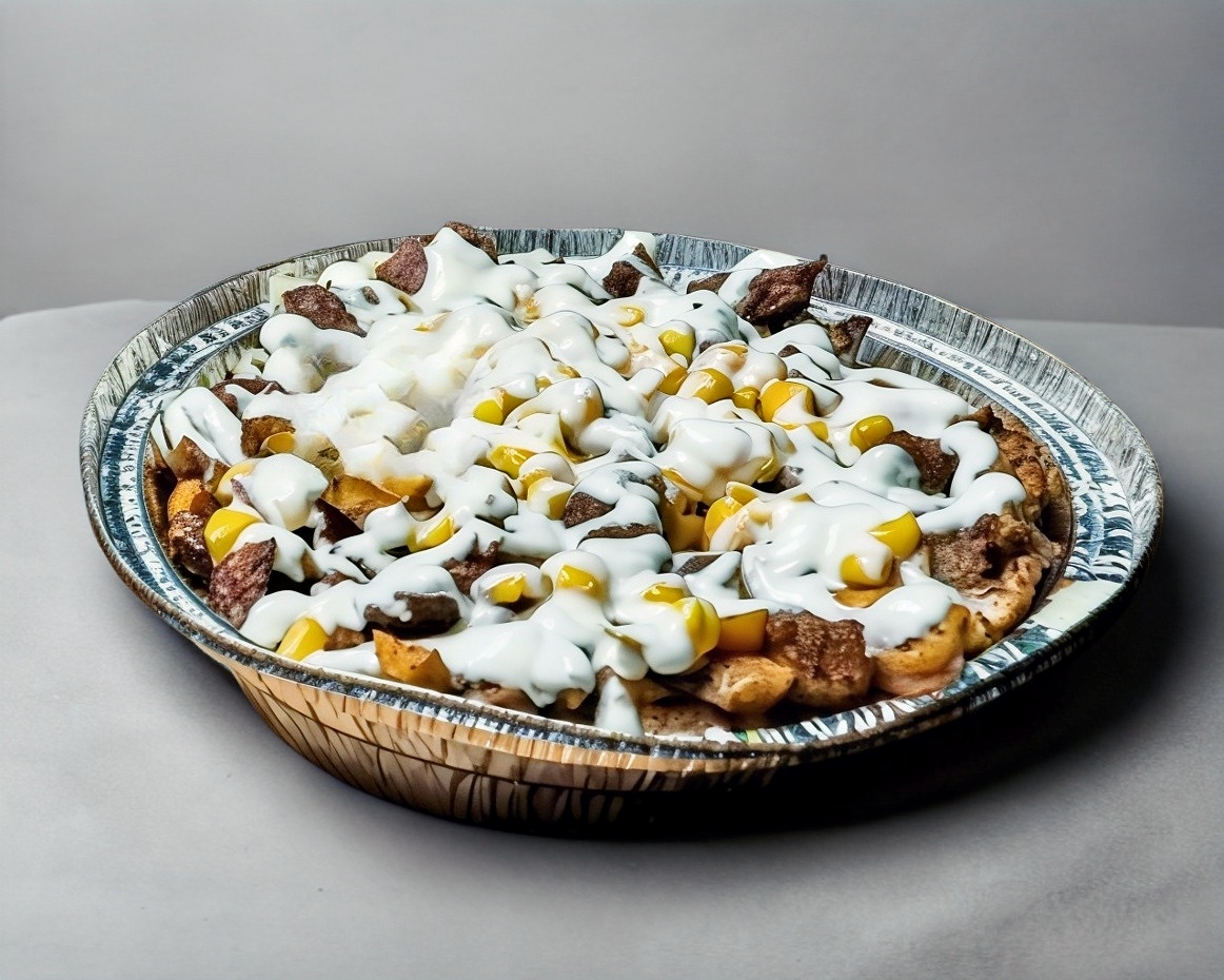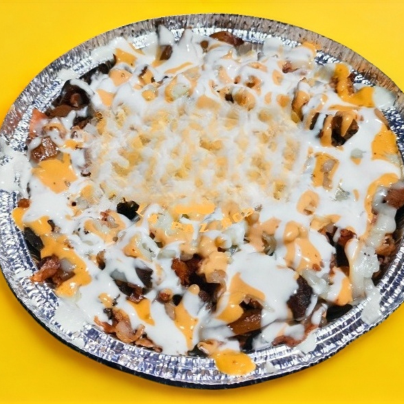 Papa natural, carne asada, pastor, tocino, champiñones, extra queso gratinado en la parte superior, crema de la casa y chipotle si señor.