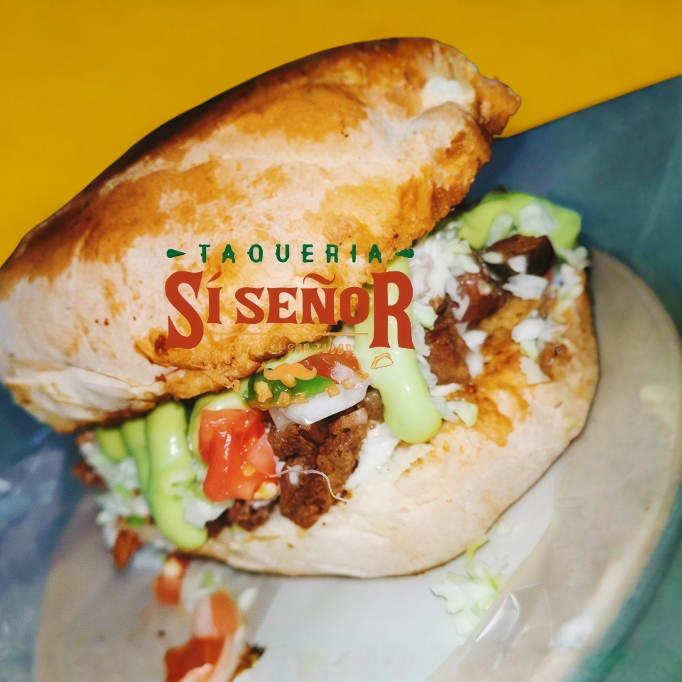Súper burro de pastor con queso gratinado, repollo, salsa mexicana (tomate, cebolla y chile jalapeño), guacamole, salsa verde y crema de la casa.