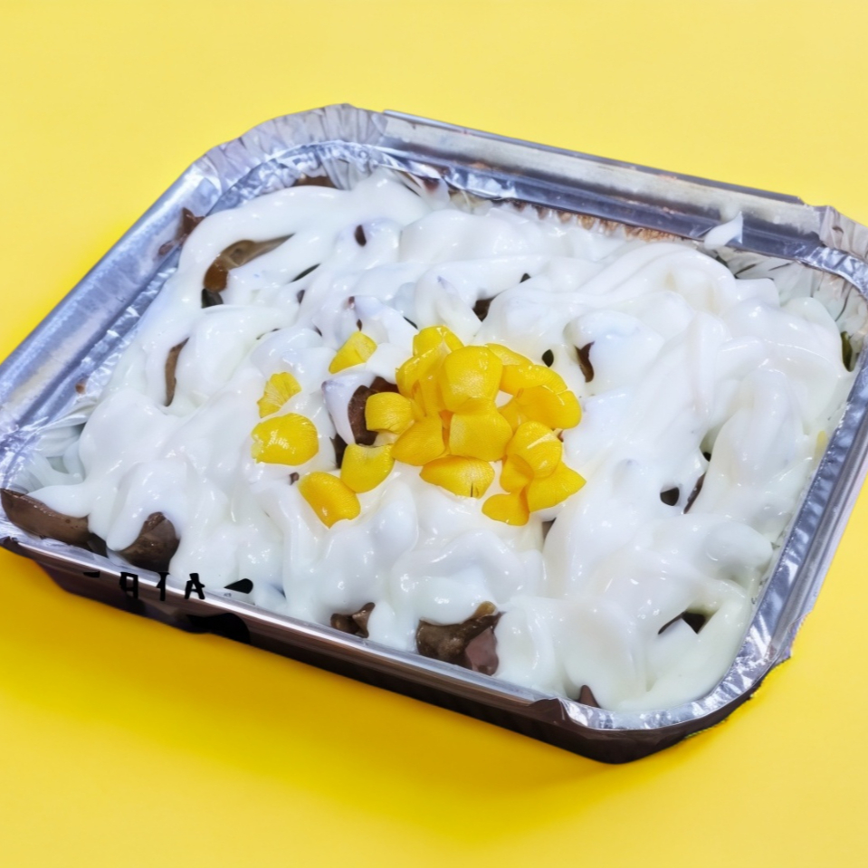 Papa natural, carne asada, salchicha para asar y champiñones guisados en salsa picosa, TRIPLE QUESO, crema de la casa y decorada con chile serrano.