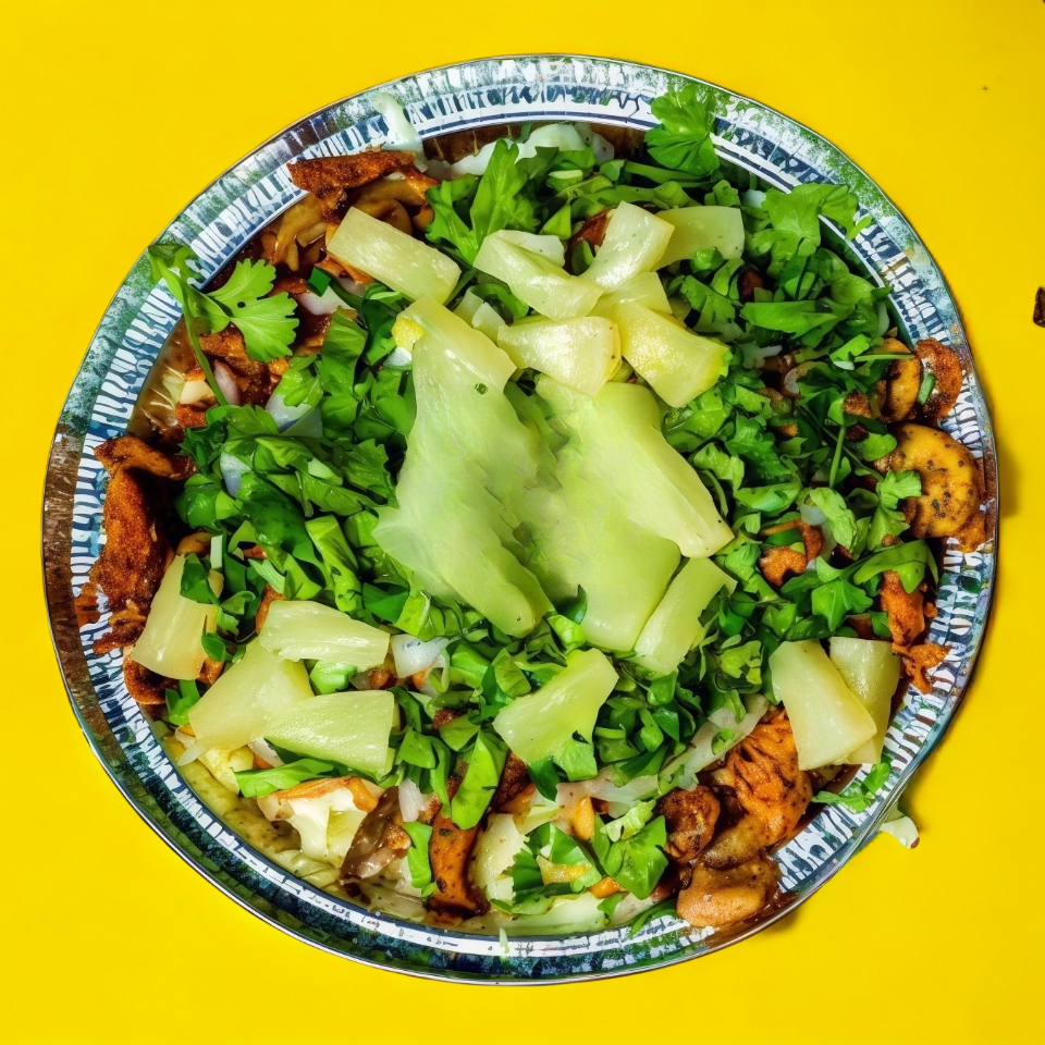 Charola 7 in con puré de papa, champiñones, queso, carne al pastor, cebolla, cilantro y piña. Incluye salsa mexicana (cebolla, tomate y chile), salsa licuada, guacamole, pepino, repollo, tortillas de harina y tortillas de maíz.