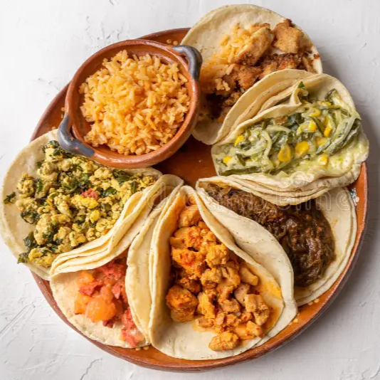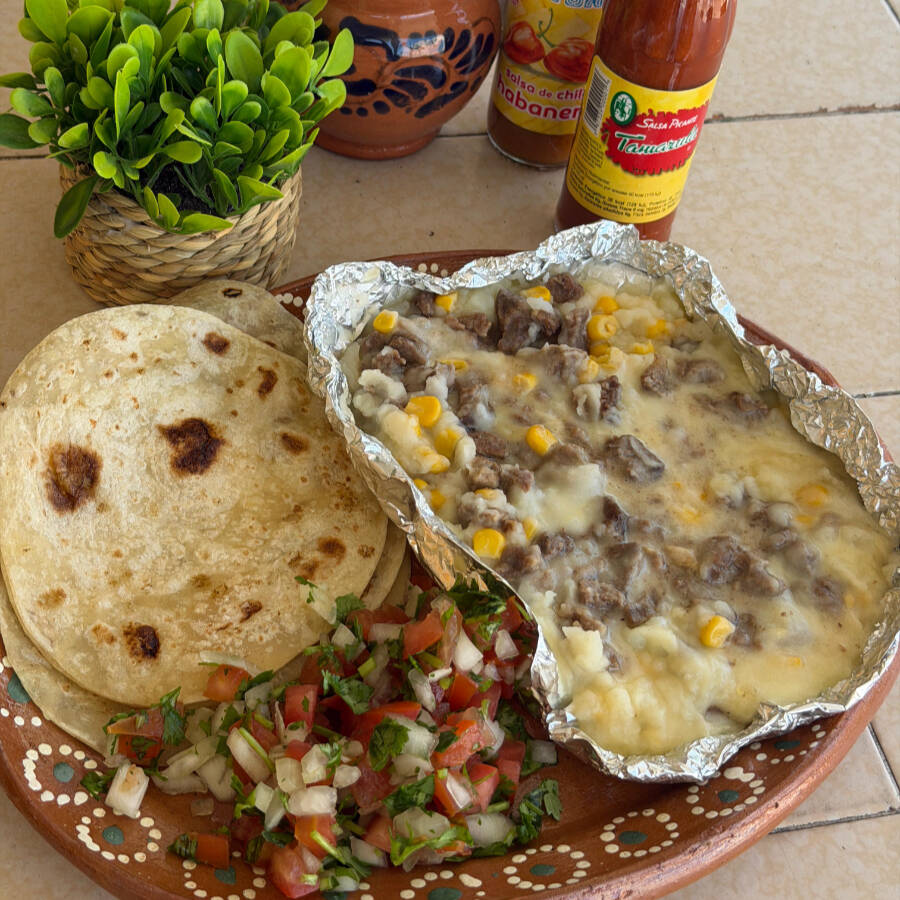 Papa rellena con elote, champiñon, queso manchego con carne de tu elección (asada o carne al pastor). Incluye tortillas, guacamole, verduras y salsa.