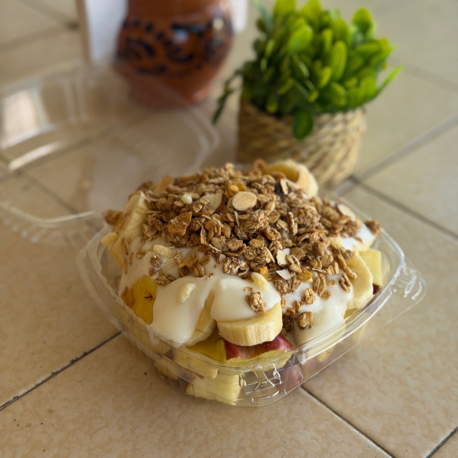 frutas de temporada en trozos, miel, yogurt natural y queso cottage