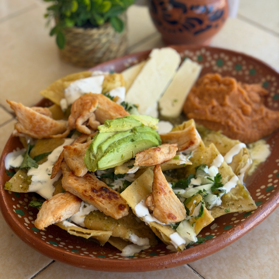 chilaquiles en salsa verde o roja, con proteína (barbacoa, pollo, huevo) con guarnición de frijol.