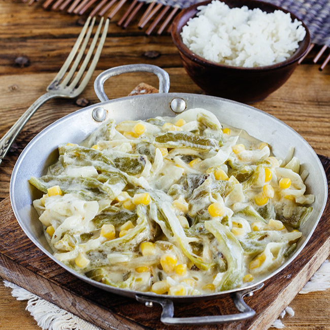 rajas con crema por litro, incluye salsa, tortillas y verdura.