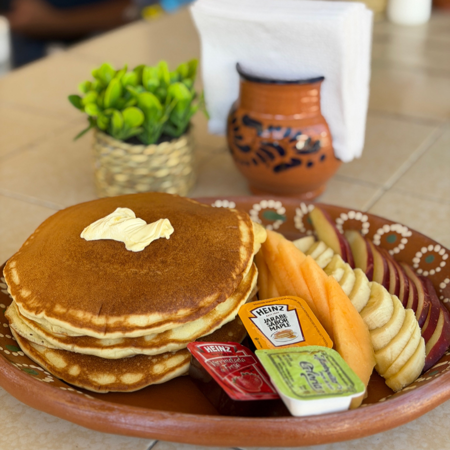 3 piezas de hotcakes acompañados con fruta de temporada, mermelada de fresa, miel maple y mantequilla.