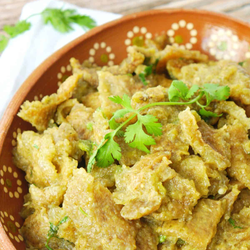 Chicharron en salsa verde por litro, incluye salsa, tortillas y verdura.