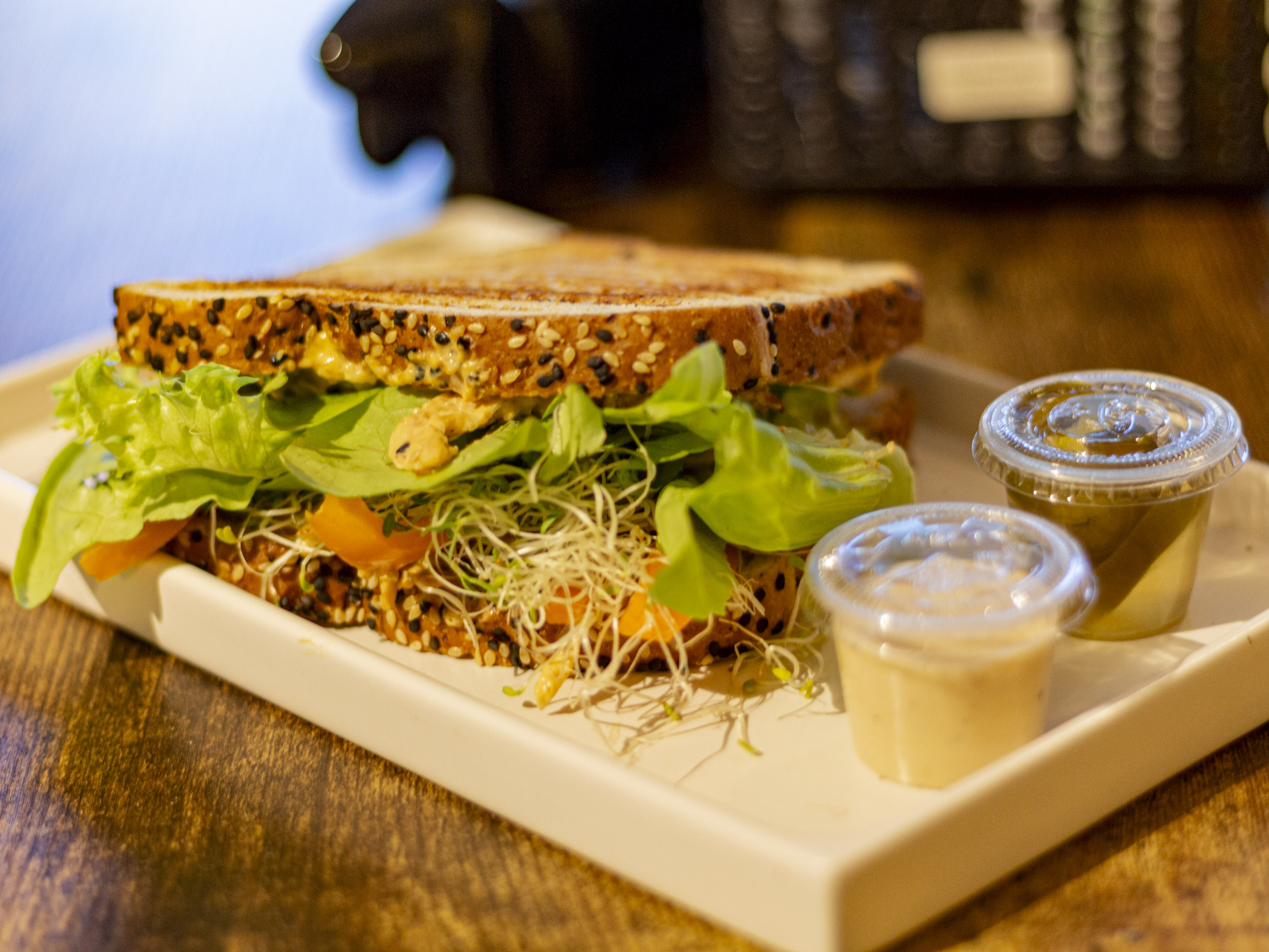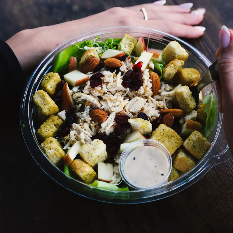 Base de lechuga y germinado de alfalfa, 60g de pechuga de pollo, manzana, arándanos deshidratados, almendras y 30g de crotones acompañado de aderezo césar