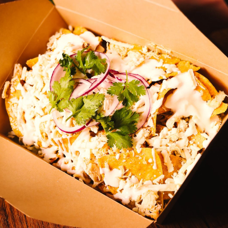 Base de totopos de maíz crujientes bañados en nuestra salsa verde artesanal, elaborada con tomate verde. Servidos con huevo revuelto, crema fresca, queso rallado y cebolla morada.