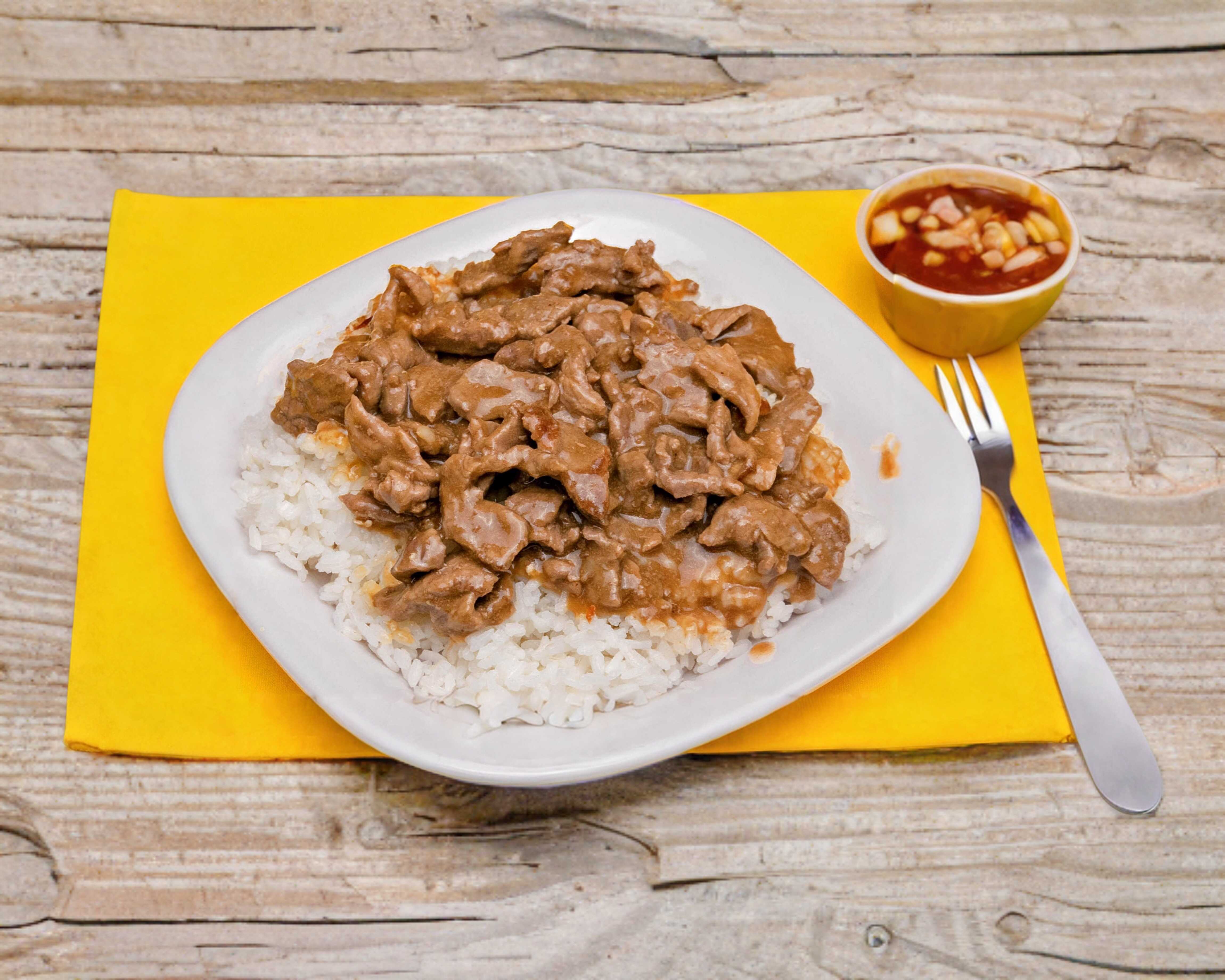 Arroz blanco con pollo Incluye una salsita de chiles toreados.