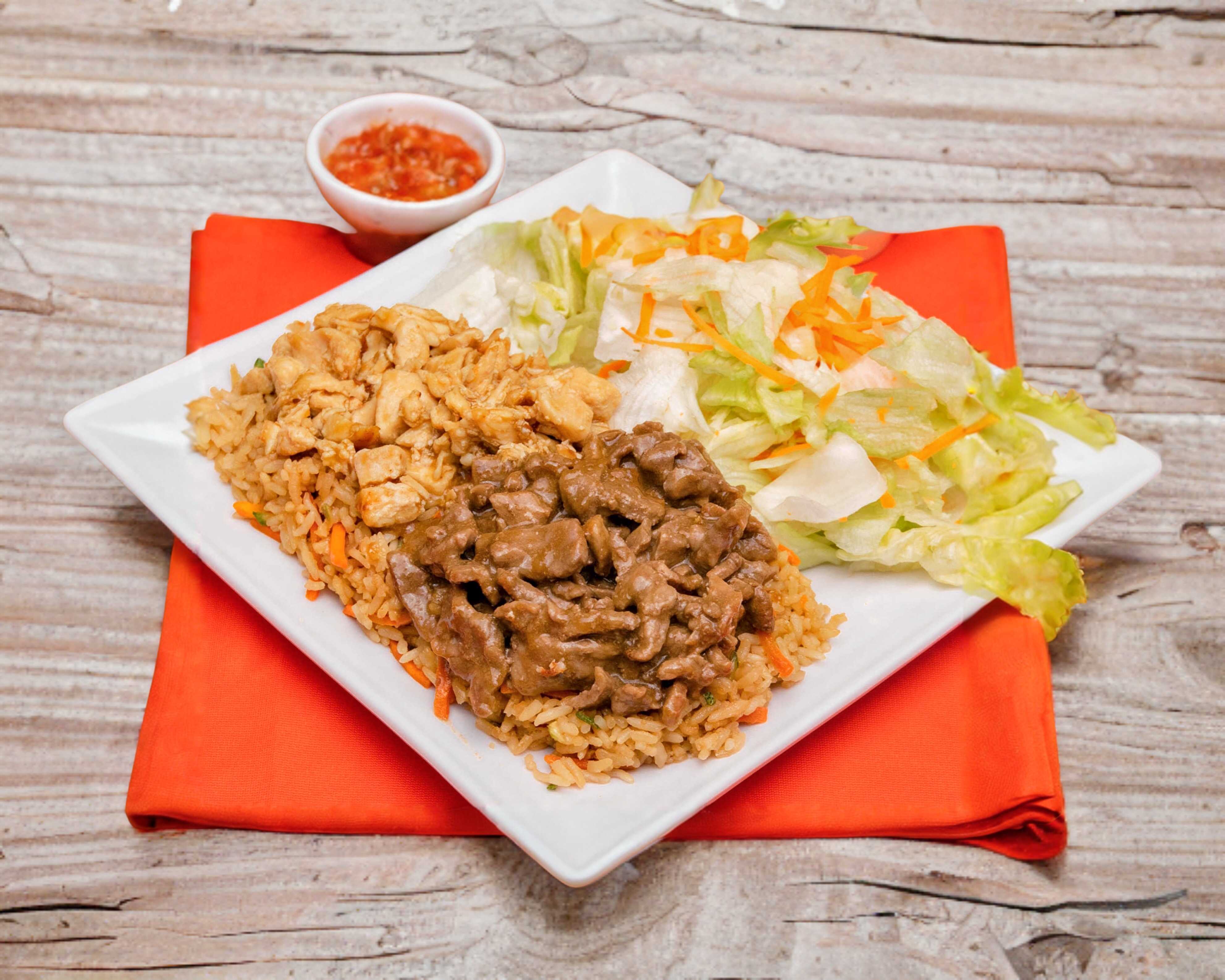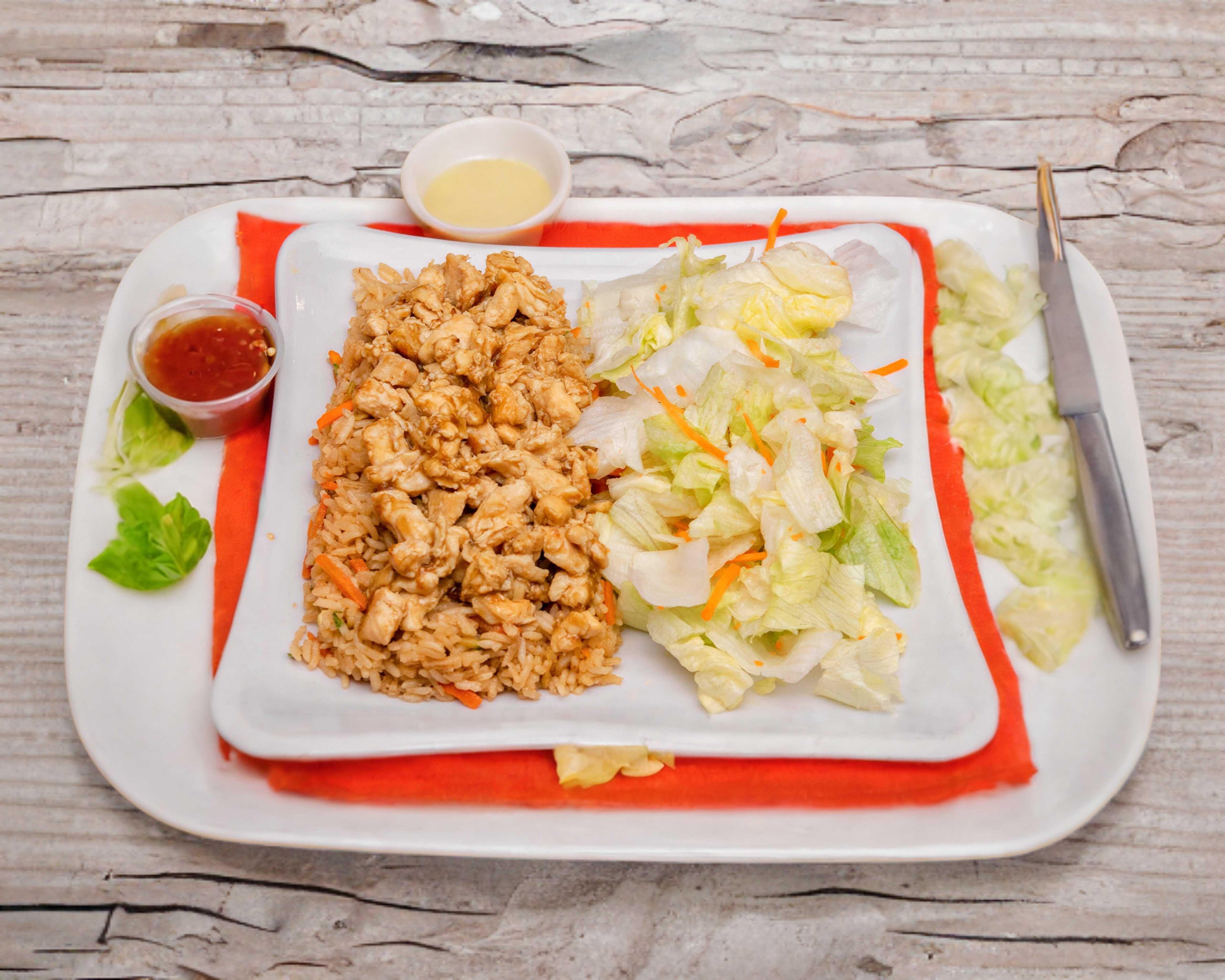 (Aprox. 250 g de arroz frito 100 g de ensalada 100 g de pollo ) incluye salsa de chile toreado y aderezo