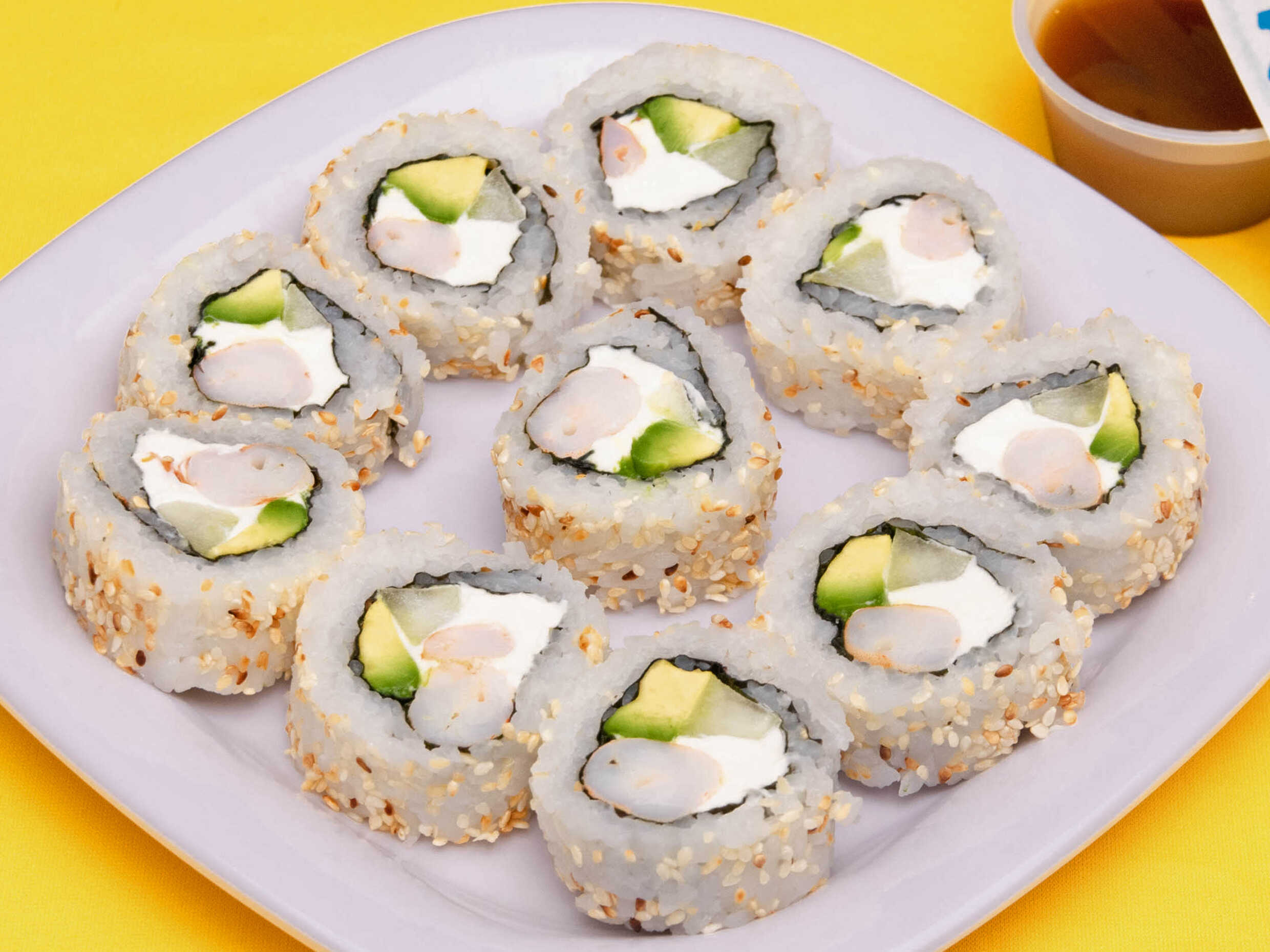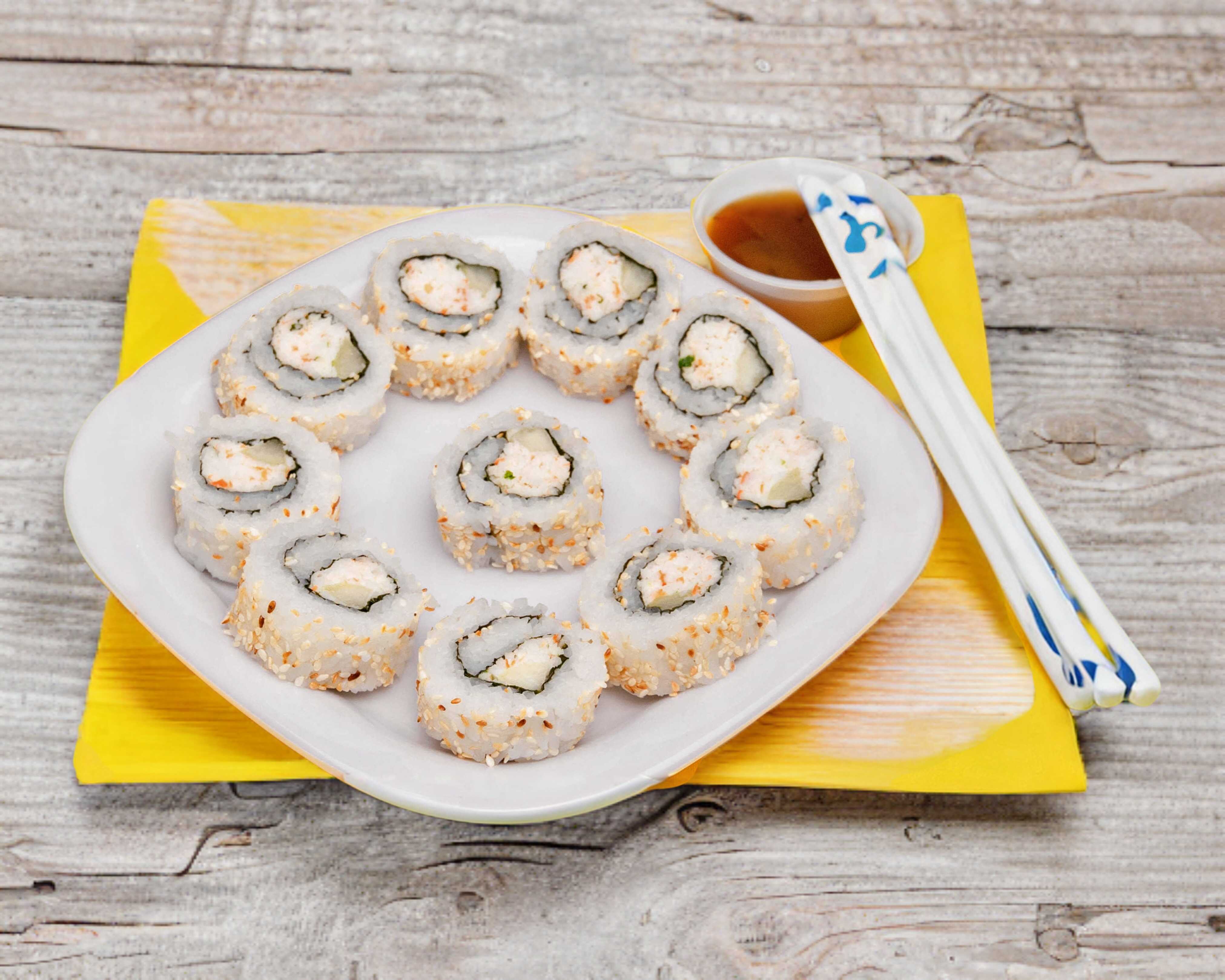 1 rollo de 10 pzs con camarón, queso crema, pepino y aguacate, ajonjolí por fuera. Acompañado de salsa