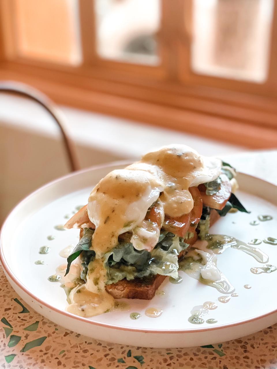 Pan hogaza, huevo, aguacate, espinacas, hojas de menta, tomate cherry, aceite de oliva, queso burrata y
