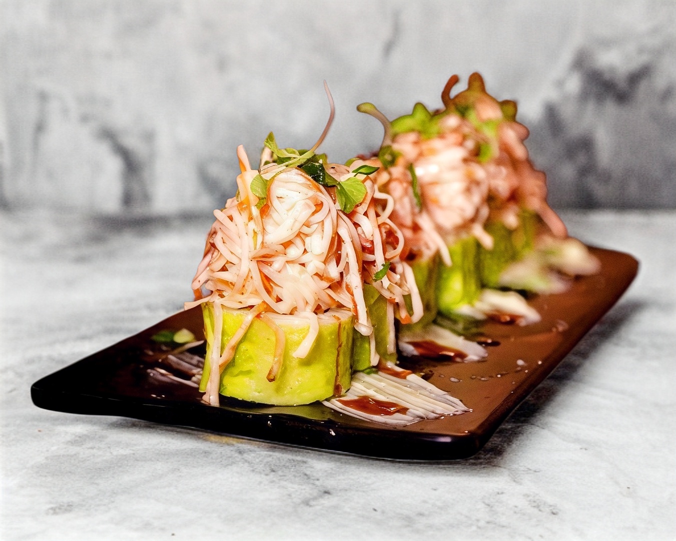 Laminas de pescado rellenas de kanikama, pepino y aguacate, servido con aderezo de cilantro y salsas de la casa.