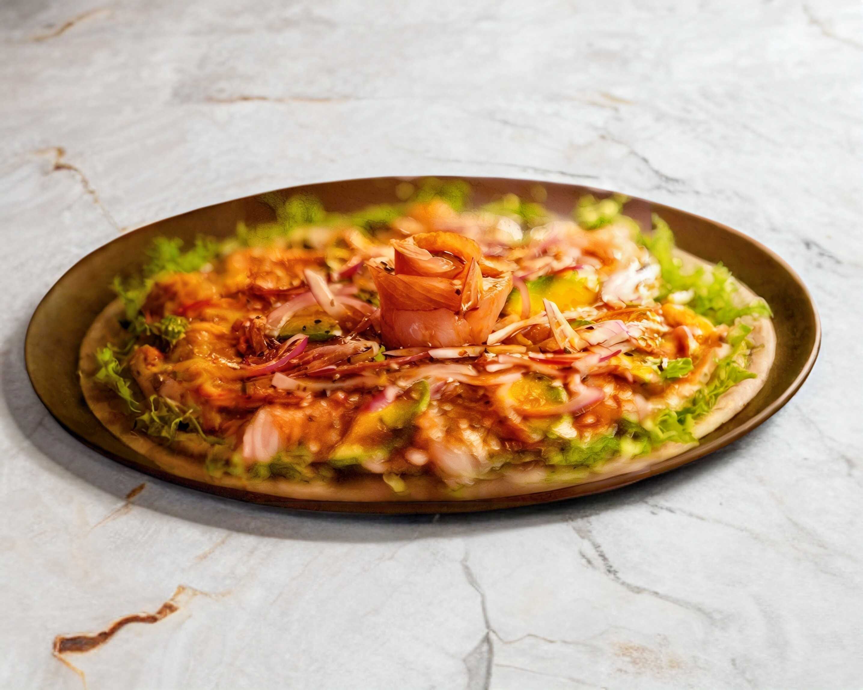 Relleno de res, pollo y philadelphia con un topping de camarón, res, pollo, tocino, queso, coronado con rodajas de chile serrano y aguacate, bañado con crem de chipotle y salsa de anguila.