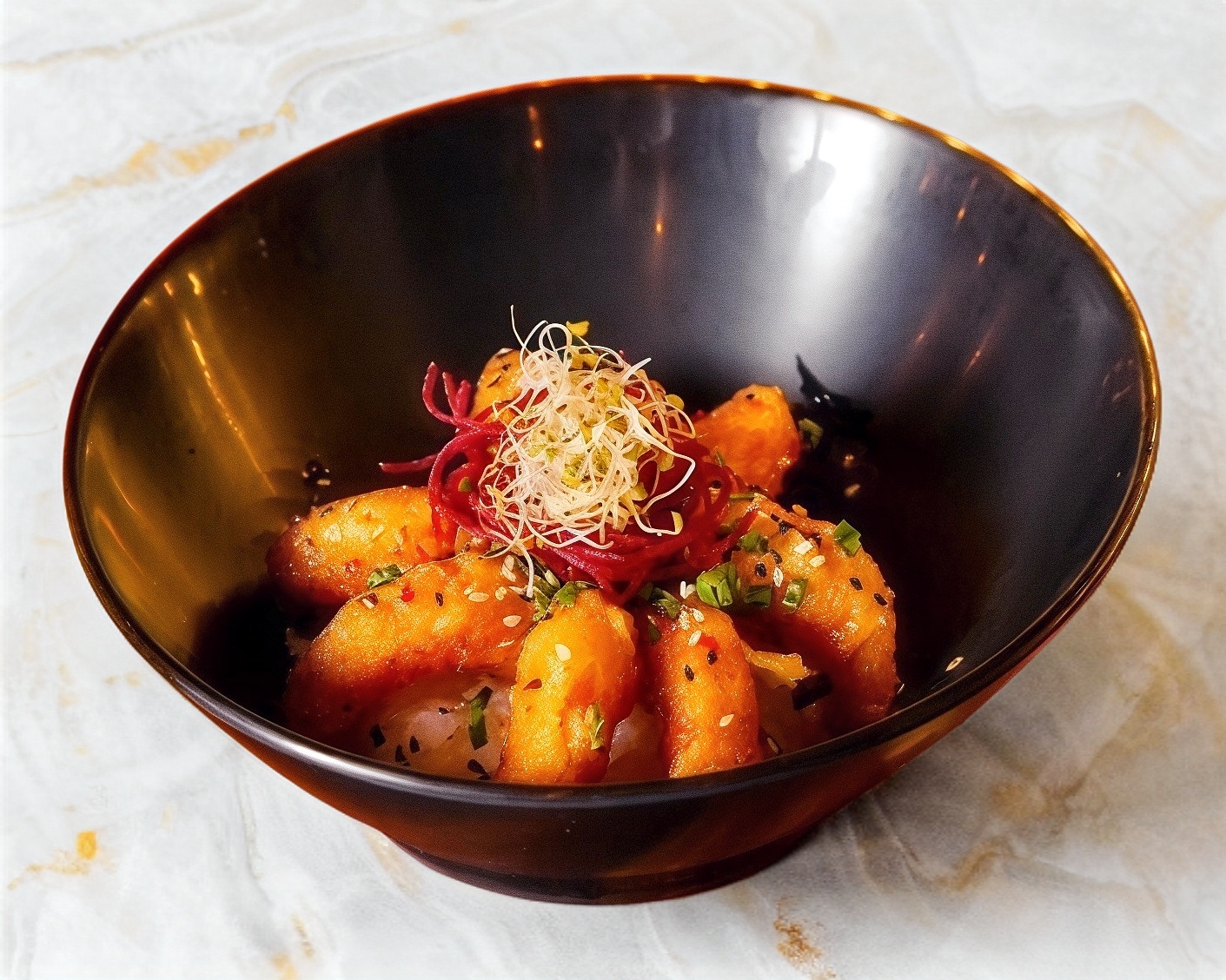 Camarones tempura, bañados con nuestro aderezo spicy.