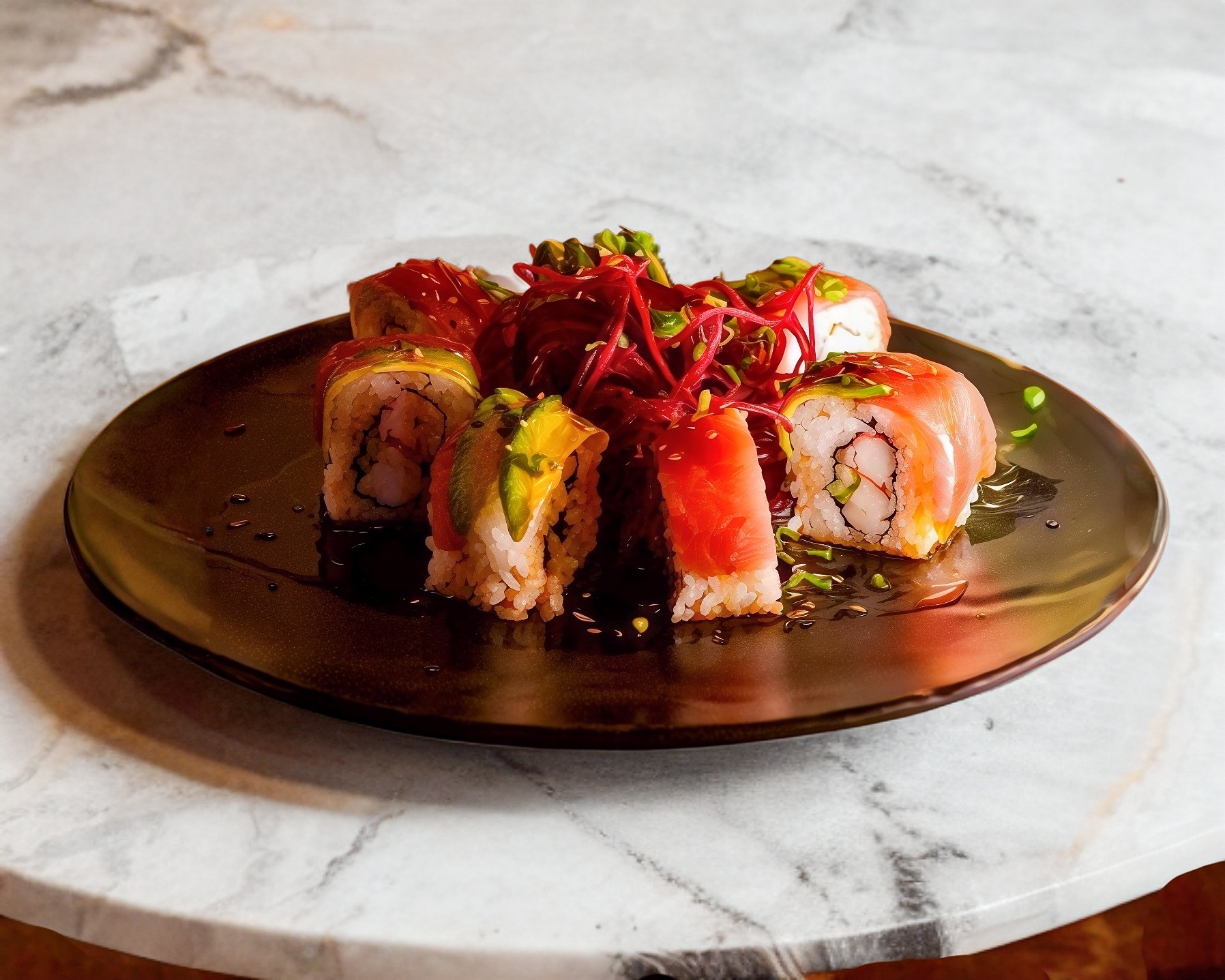 Rollo relleno de philadelphia, aguacate y camarón tempura, sobre un espejo de aderezo al curry, forrado con hojuelas de oro comestible y pimiento rojo, coronado con tobiko.