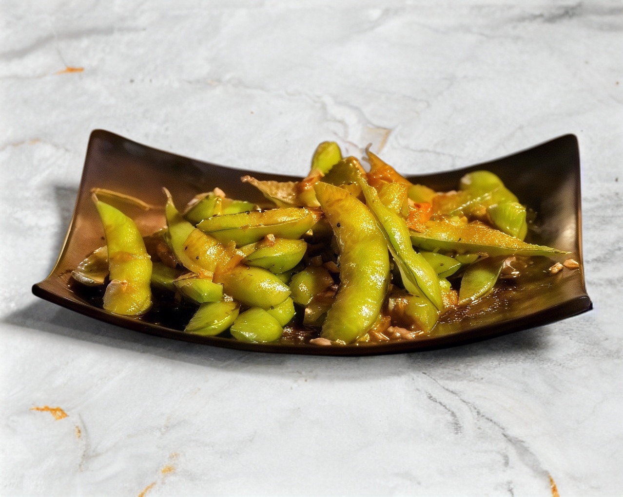 Laminas de pescado rellenas de tampico ajo curry, coronadas con laminas de aguacate y aderezo spicy, bañadas en salsa serranito.