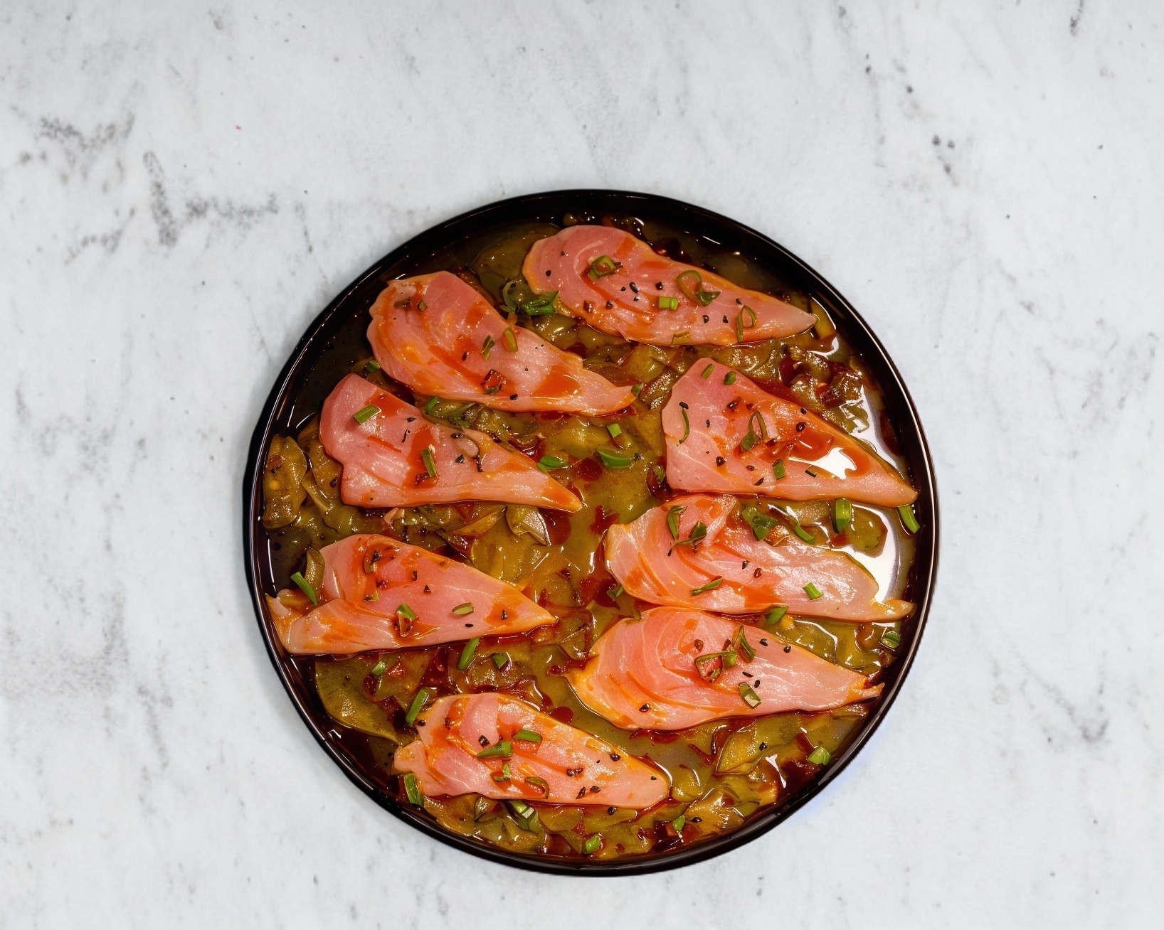 Laminas de pescado sobre una cama de ensalada japonesa de pepino con notas picantes, cebollín y una lluvia de togarashi.
