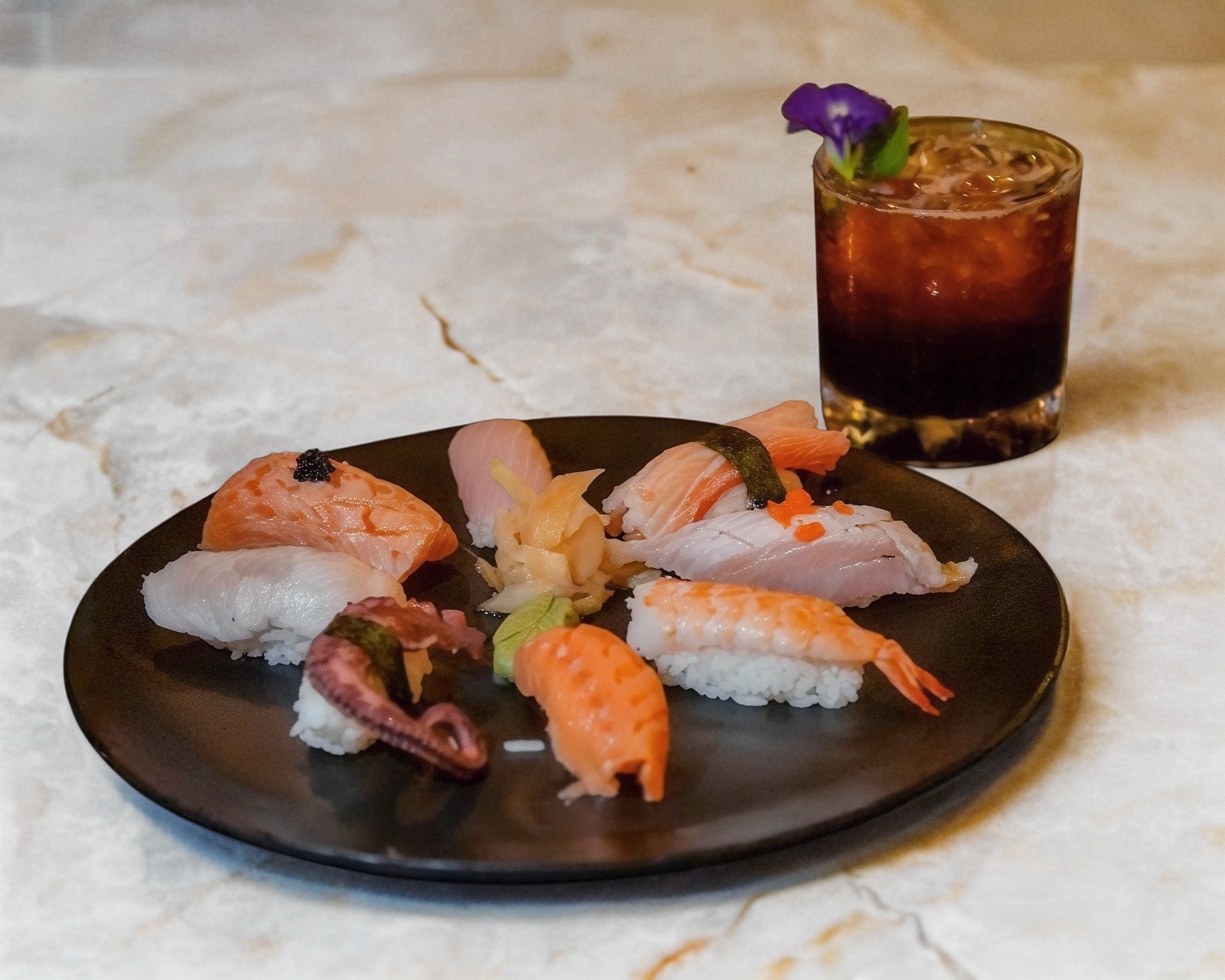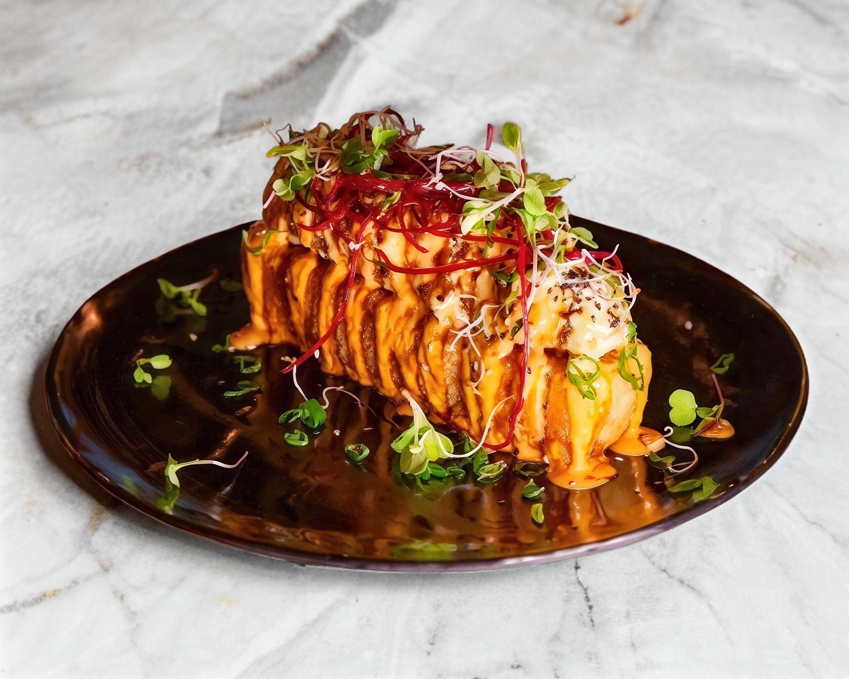 Delicioso rollo en mamenori de ajonjoli, relleno de philadelphia, aguacate, pepino y camaron crujiente, servido con un topping de pulpo y ajo al curry, coronado con tobico, arares y oro comestible.