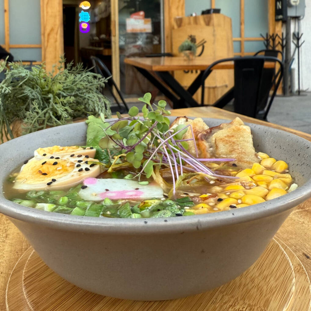 Caldo tradicional japonés a base de puerco, y miso. Fideos, elote amarillo, huevo, Naruto, espinaca, poro frito y chachu (Pork Belly).