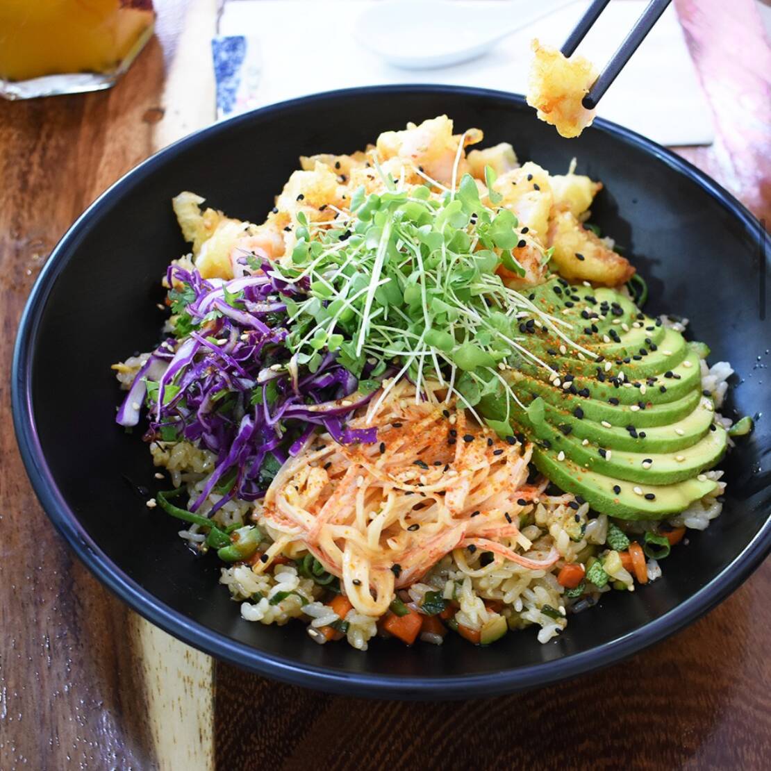 Arroz frito en aceite de ajo y jengibre, con calabaza, zanahoria y cebollín. Por encima kanikama spicy, aguacate y proteína a elegir.