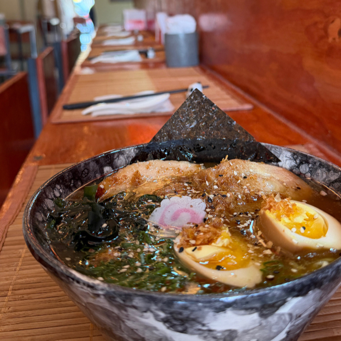 Caldo tradicional japonés a base de puerco, fideos, alga nori, huevo, Naruto, cebollín y shashu (Pork Belly). Con aceite de ajo y ajo confitado
