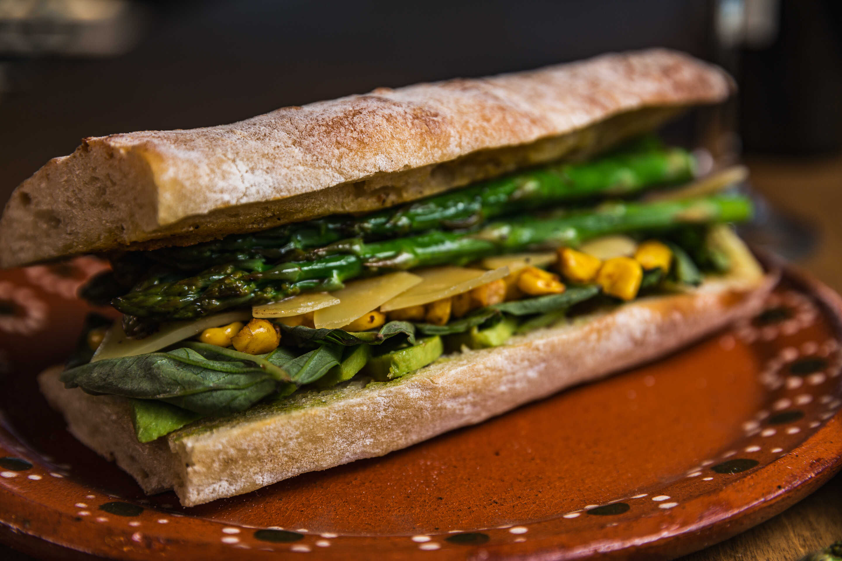 Aguacate, espárragos salteados, granos de elote amarillo, laminas de queso parmesado y albahaca.
