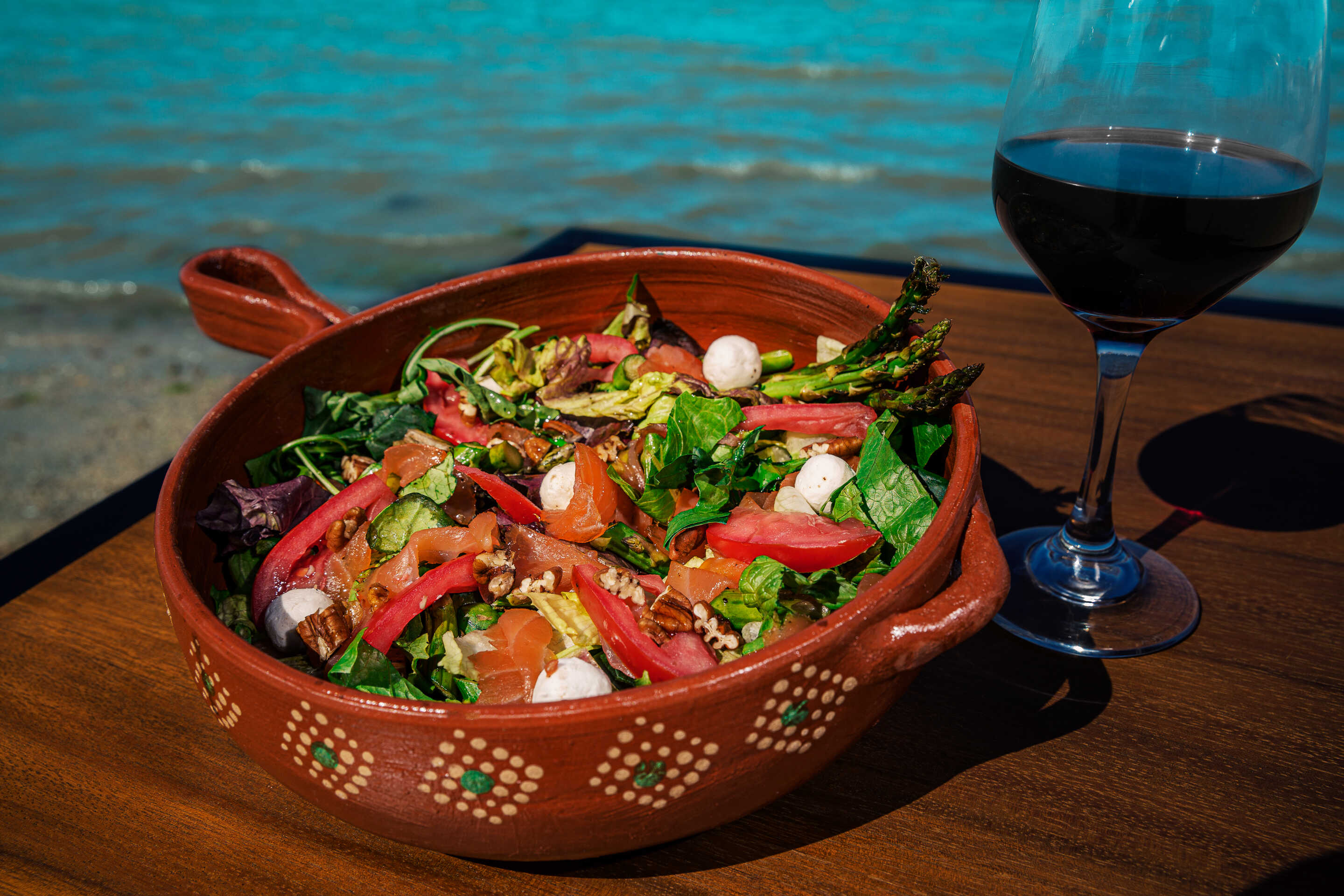 Lechugas, espinaca, arugula, jitomate, salmón ahumado, esparragos, nuez, queso de cabra bañado en aderezo de miel y mostaza.