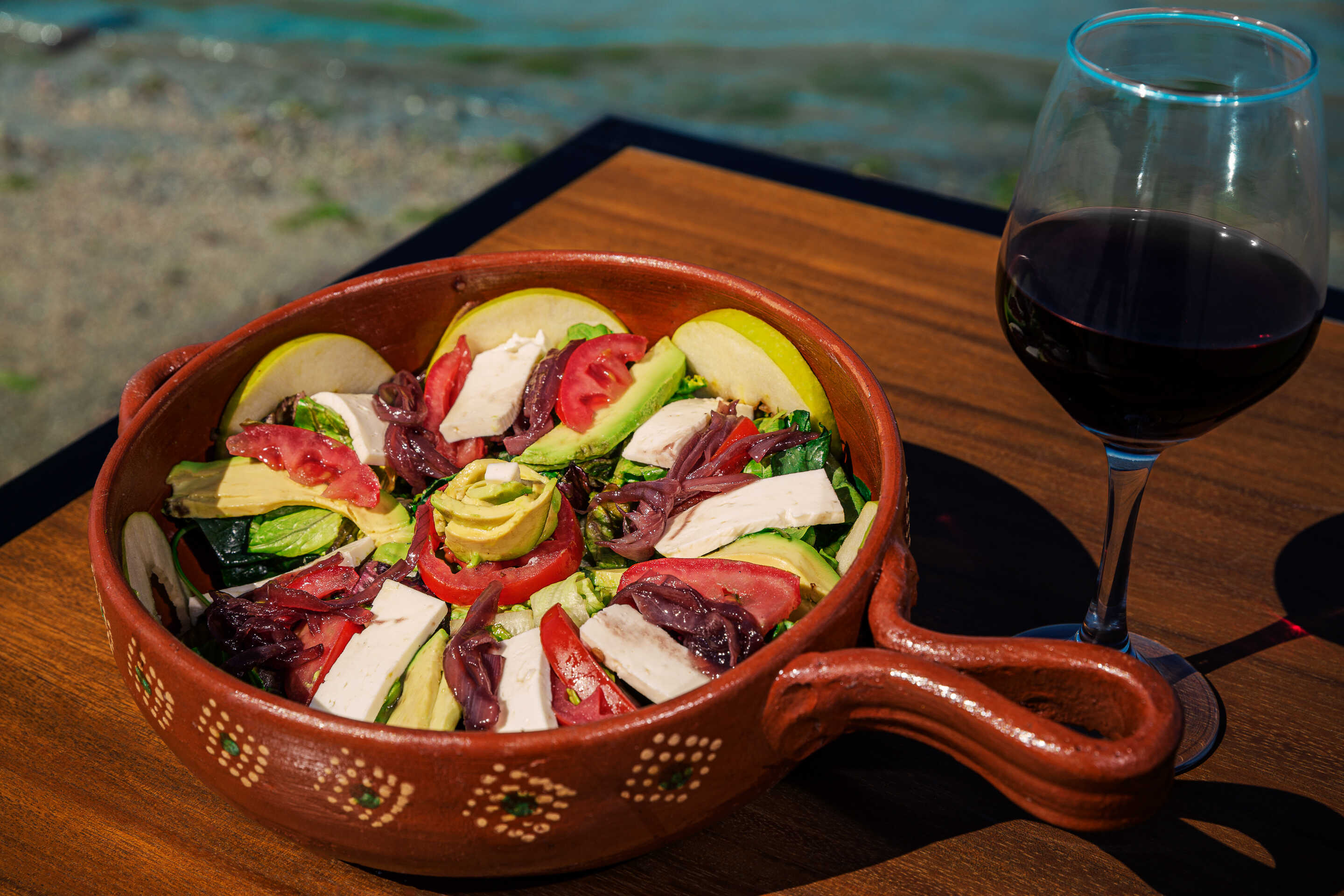 Lechugas, espinaca, jitomate, aguacate, queso panela, manzana verde, cebolla caramelizada, bañada con aderezo balsamico.