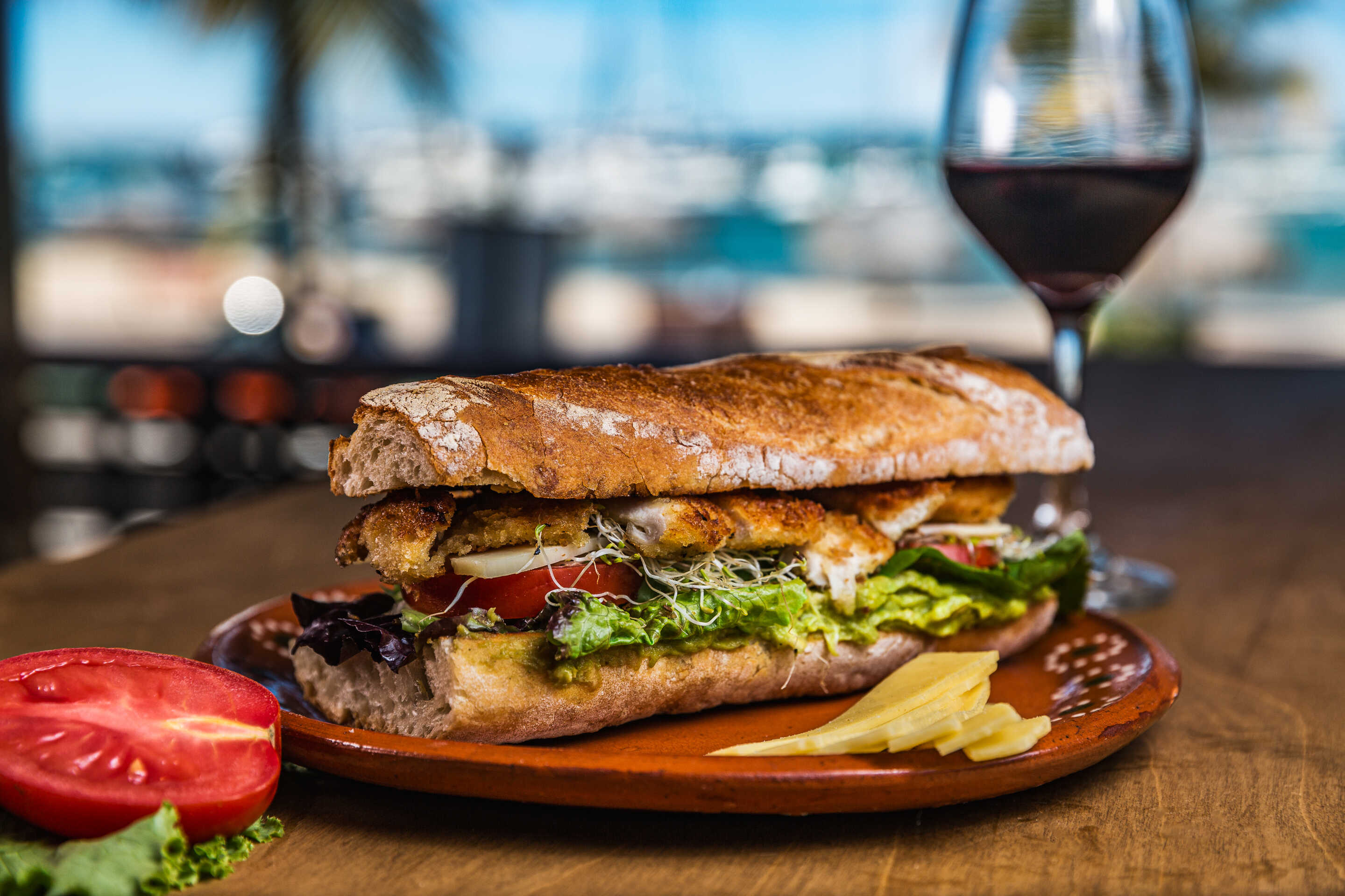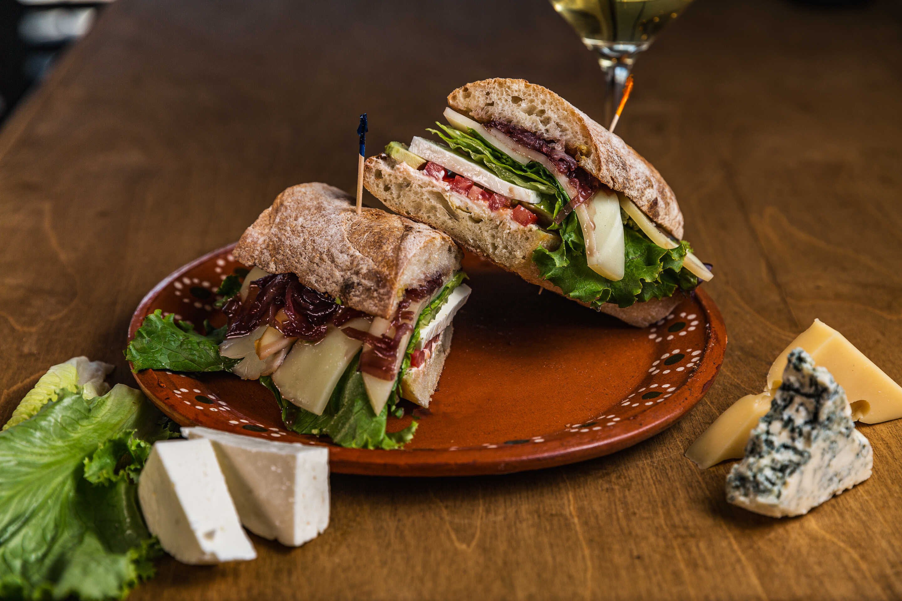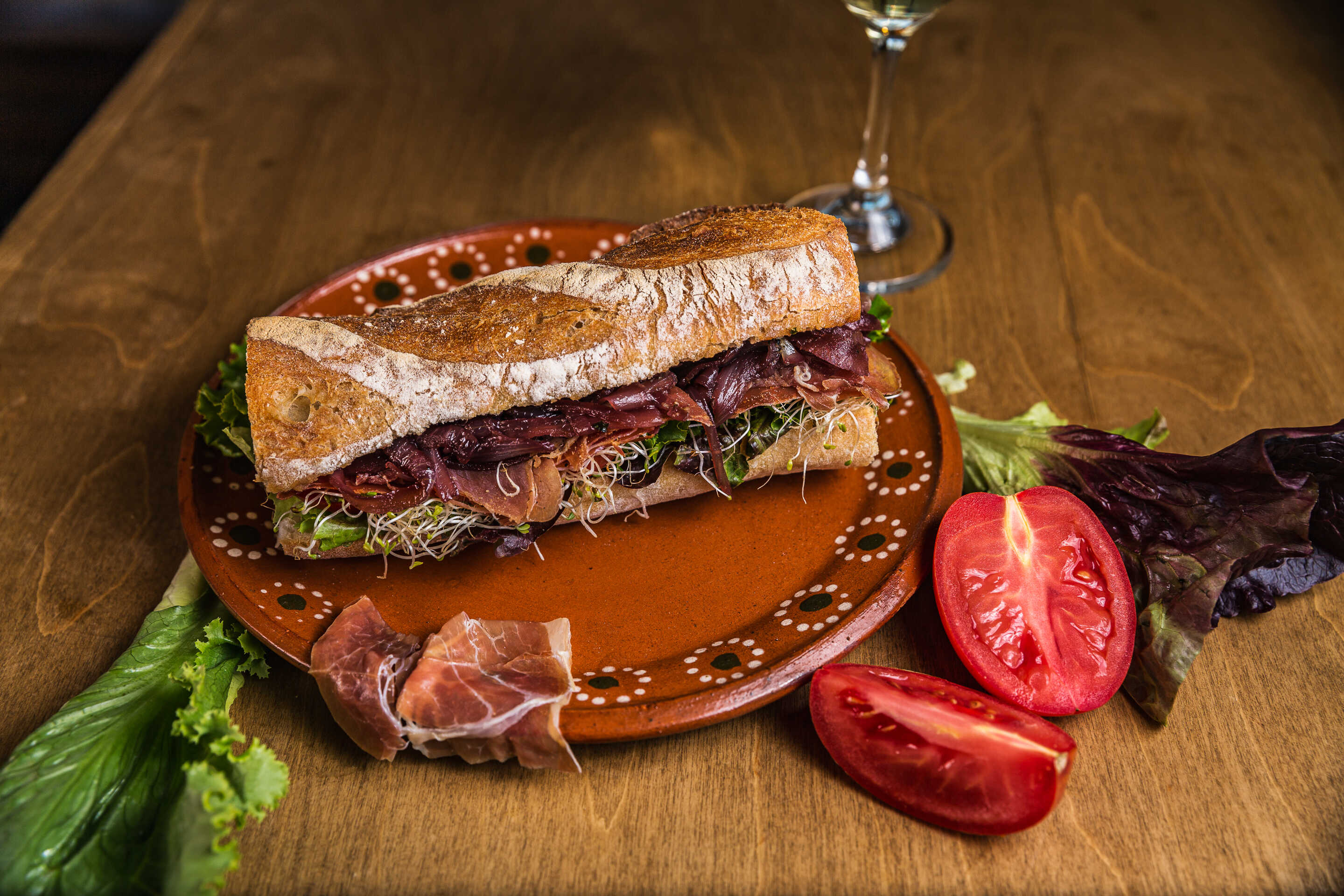 Pastrana, queso provolone ahumado sobre una cama de lechugas, arugula, tomate, aguacate y pepinillos en pan de focaccia.