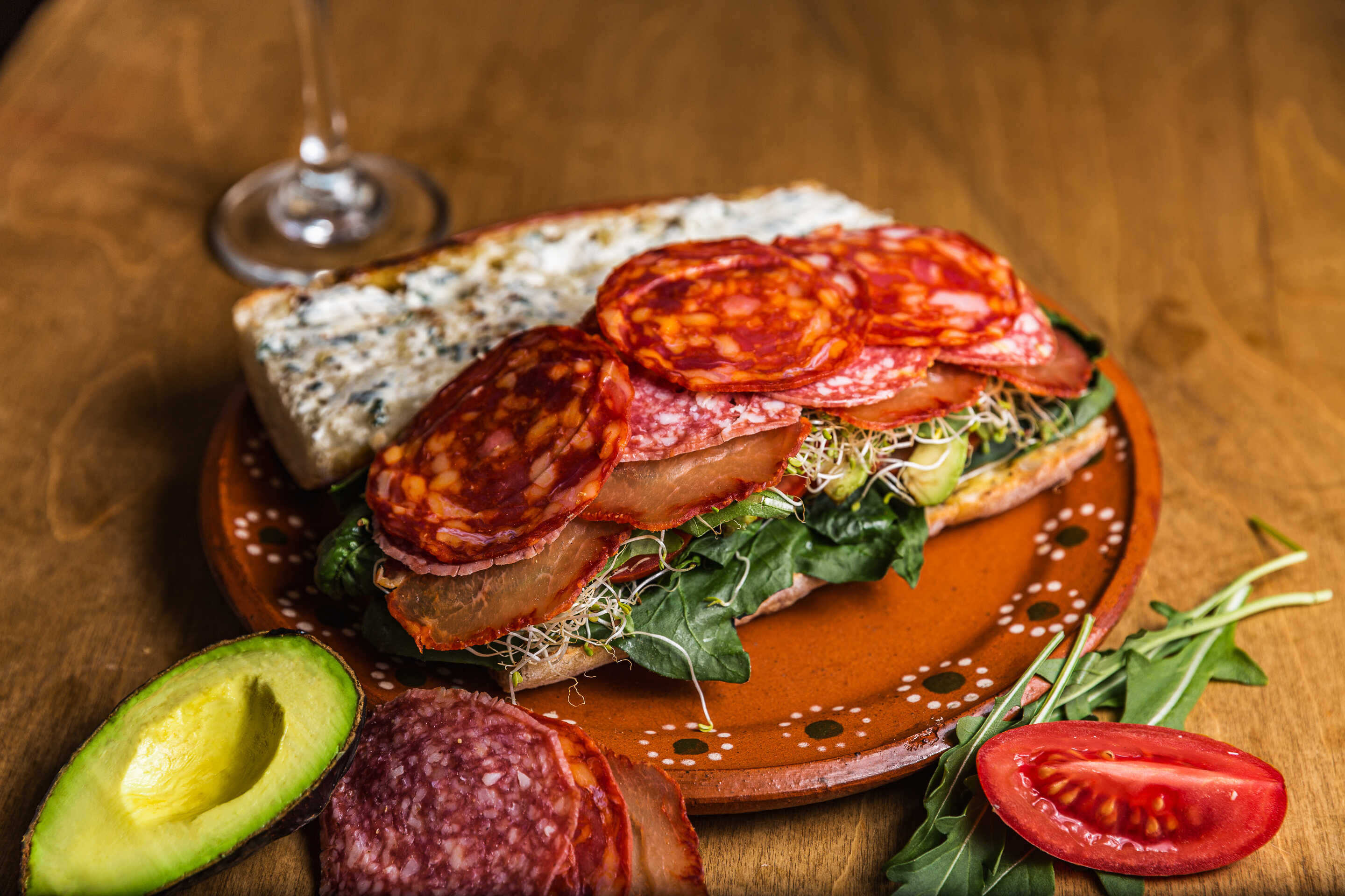Salami, lomo embuchado, chorizo de pamplona sobre una cama de espinaca, jitomate, aguacate, germen de alfalfa y arugula