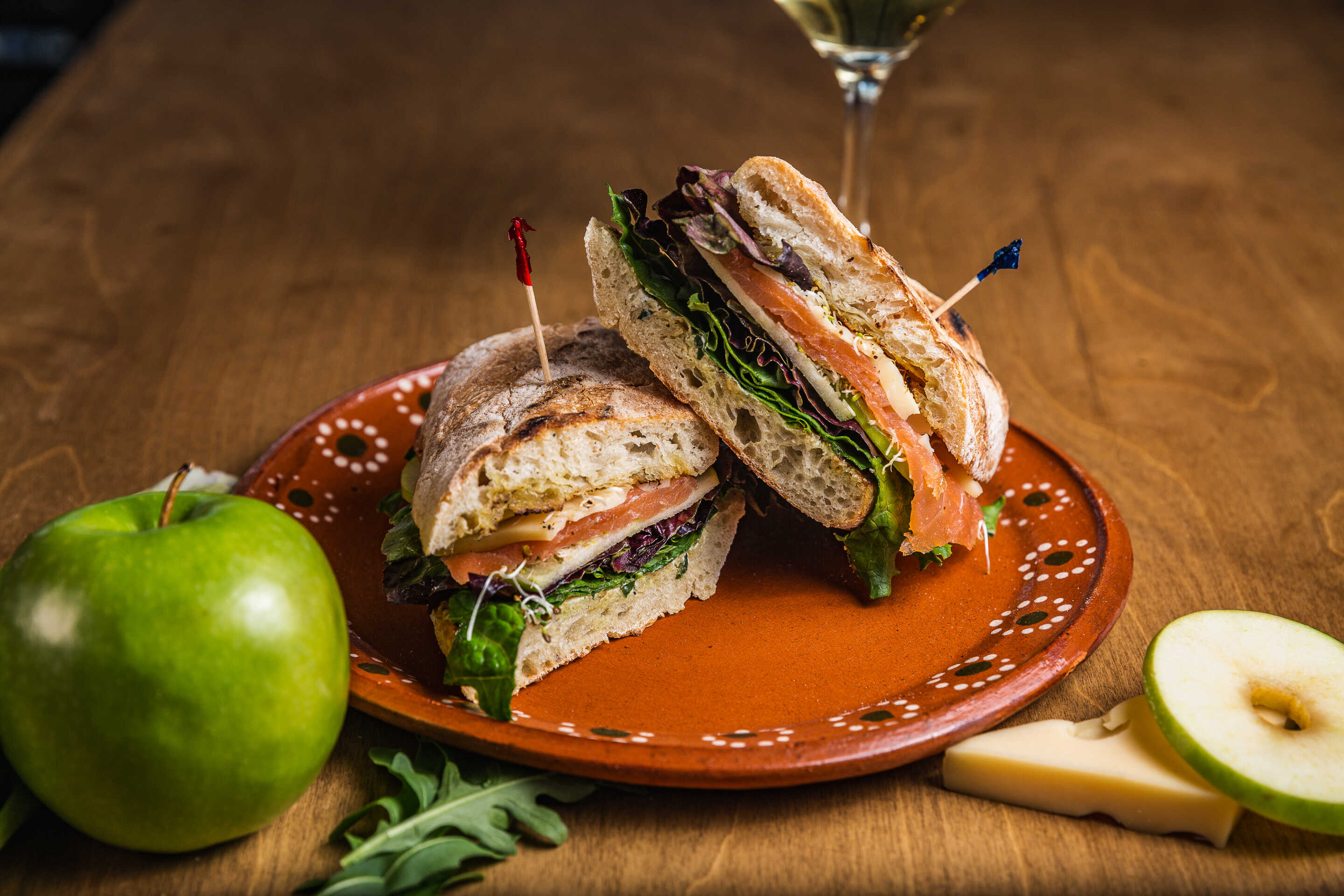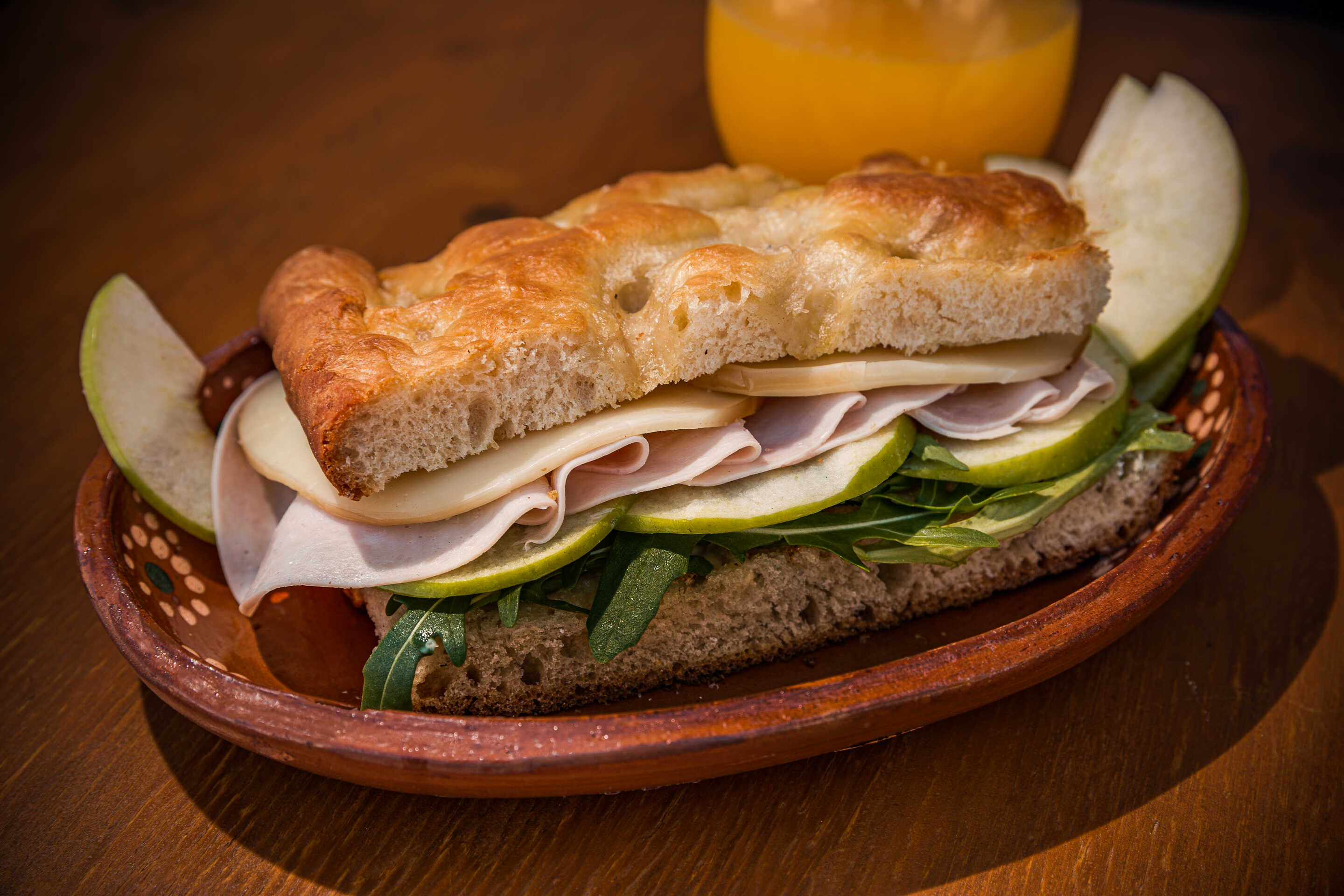Pechuga de pavo, queso provolone ahumado, manzana verde y arugula.