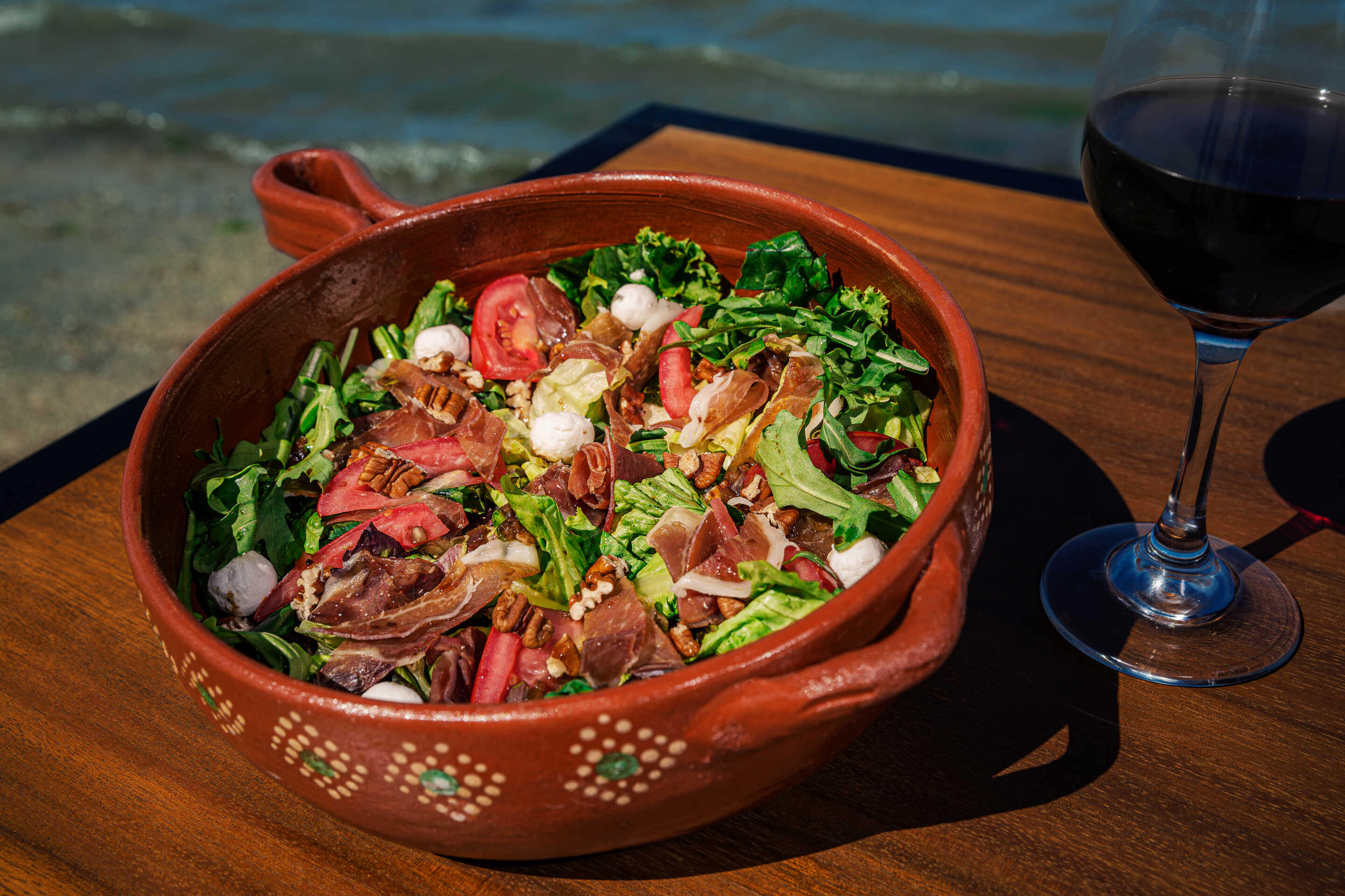 Lechugas, arugula, espinaca, jitomate, prosciutto, queso de cabra, nuez bañada con aderezo balsamico.