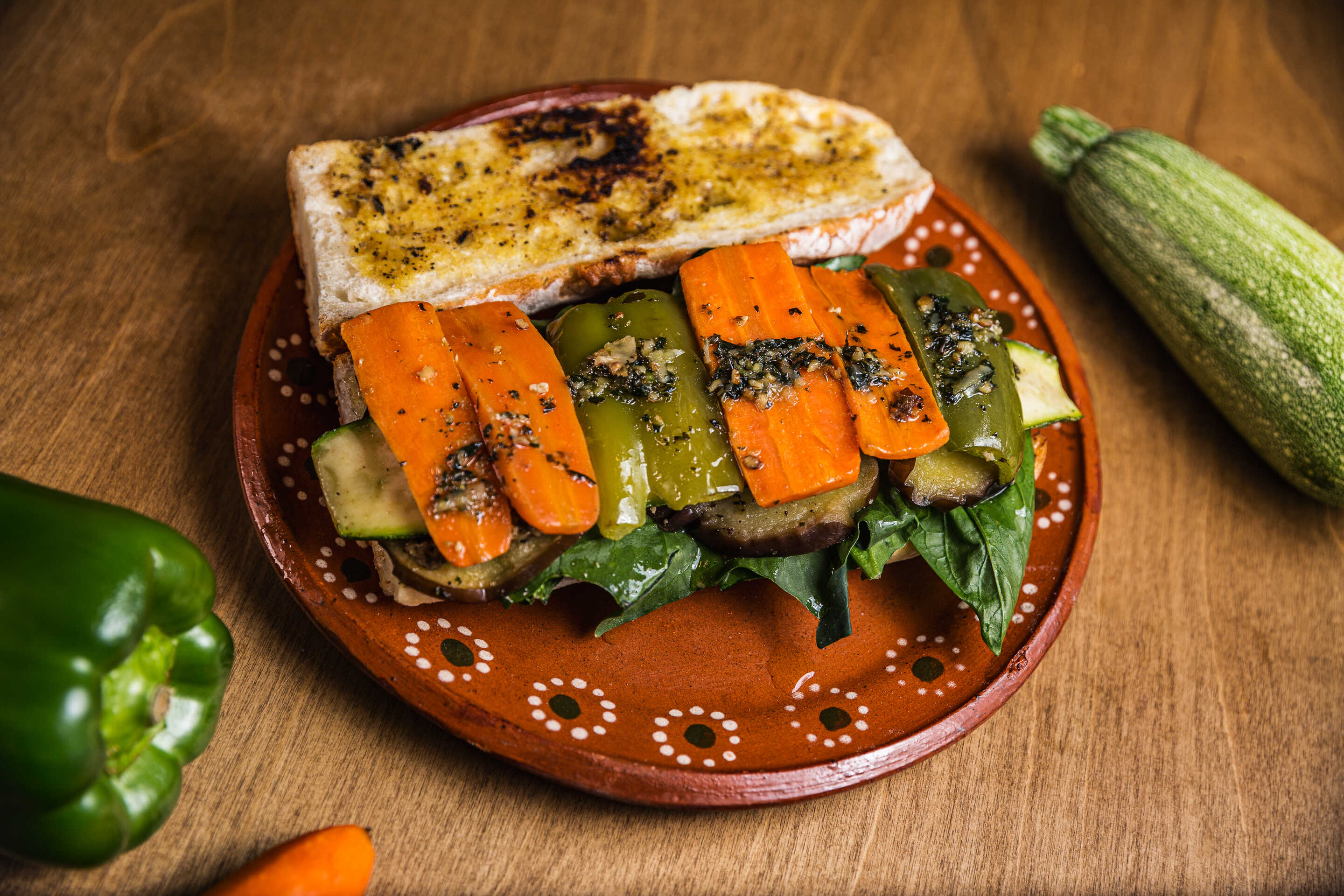 Berenjena, zanahoria, calabaza y pimiento salteados, sobre una cama de espinacas bañados en una salsa pesto de la casa