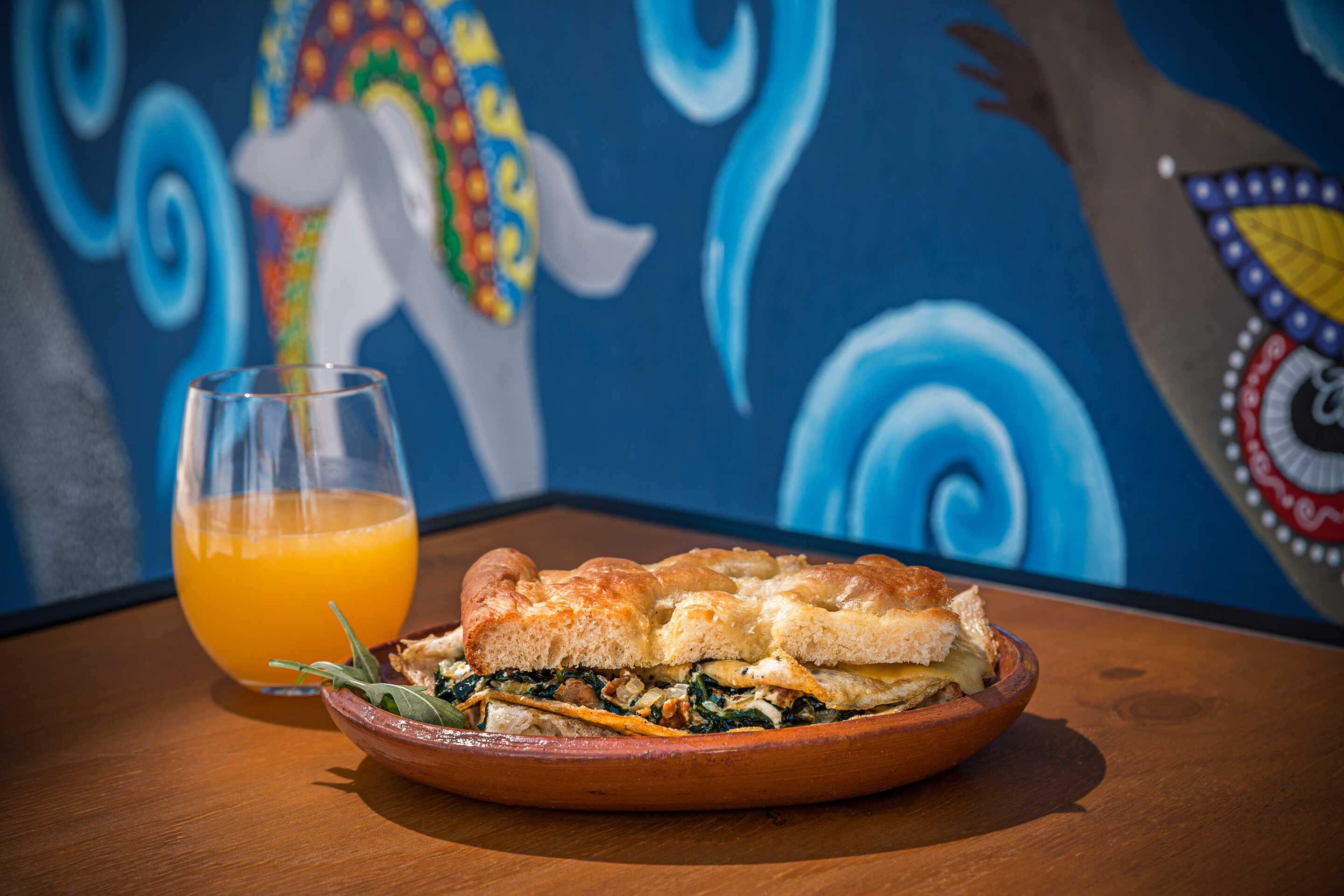 Tocino, espinaca, arugula, tomate, aguacate en pan de focaccia.